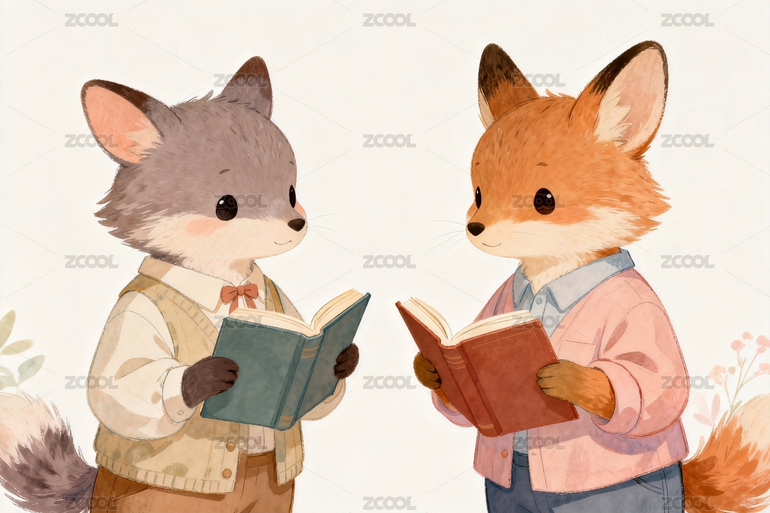 两只小狐狸共读绘本温馨画面