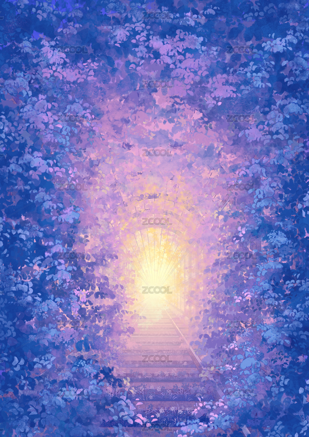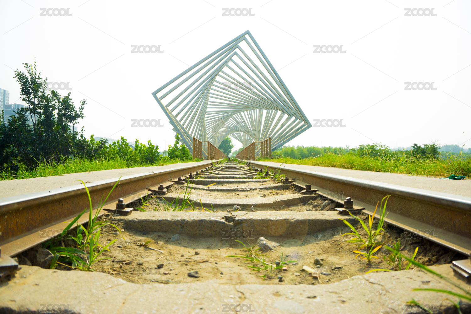 长满叶子的铁轨户外光感场景无人插画