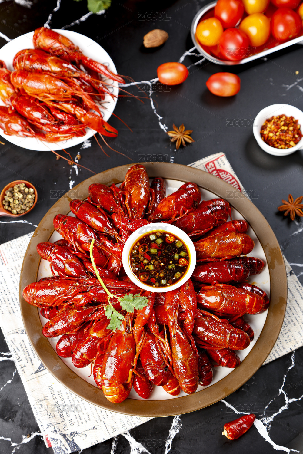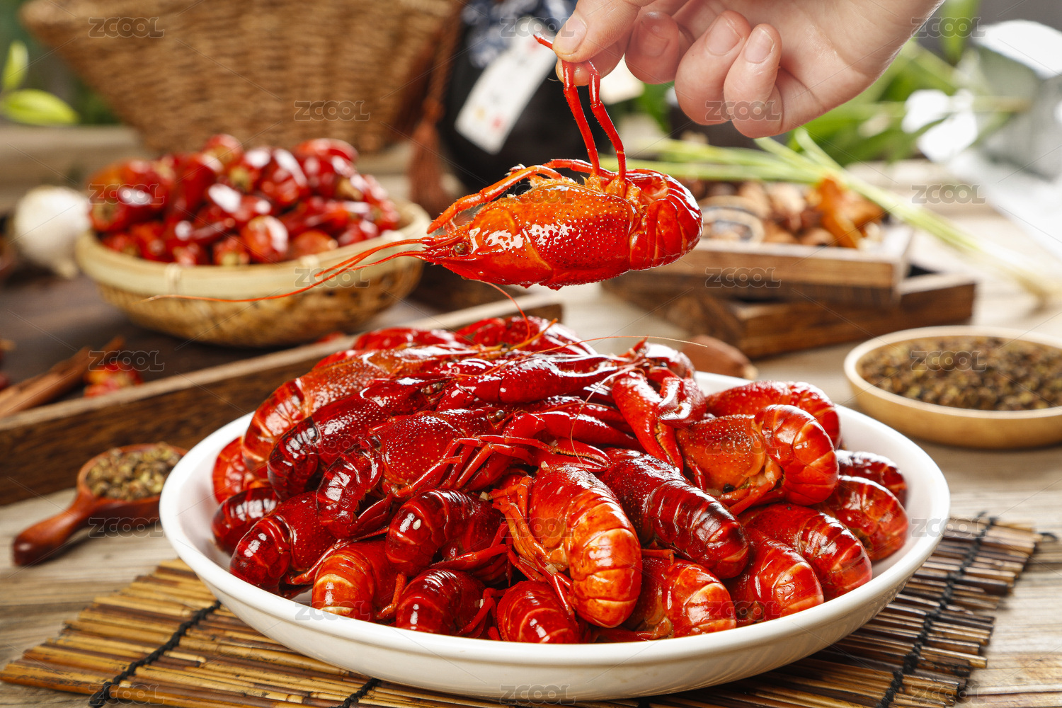 竹底上放着一盘秘制小龙虾和手上拿着小龙虾