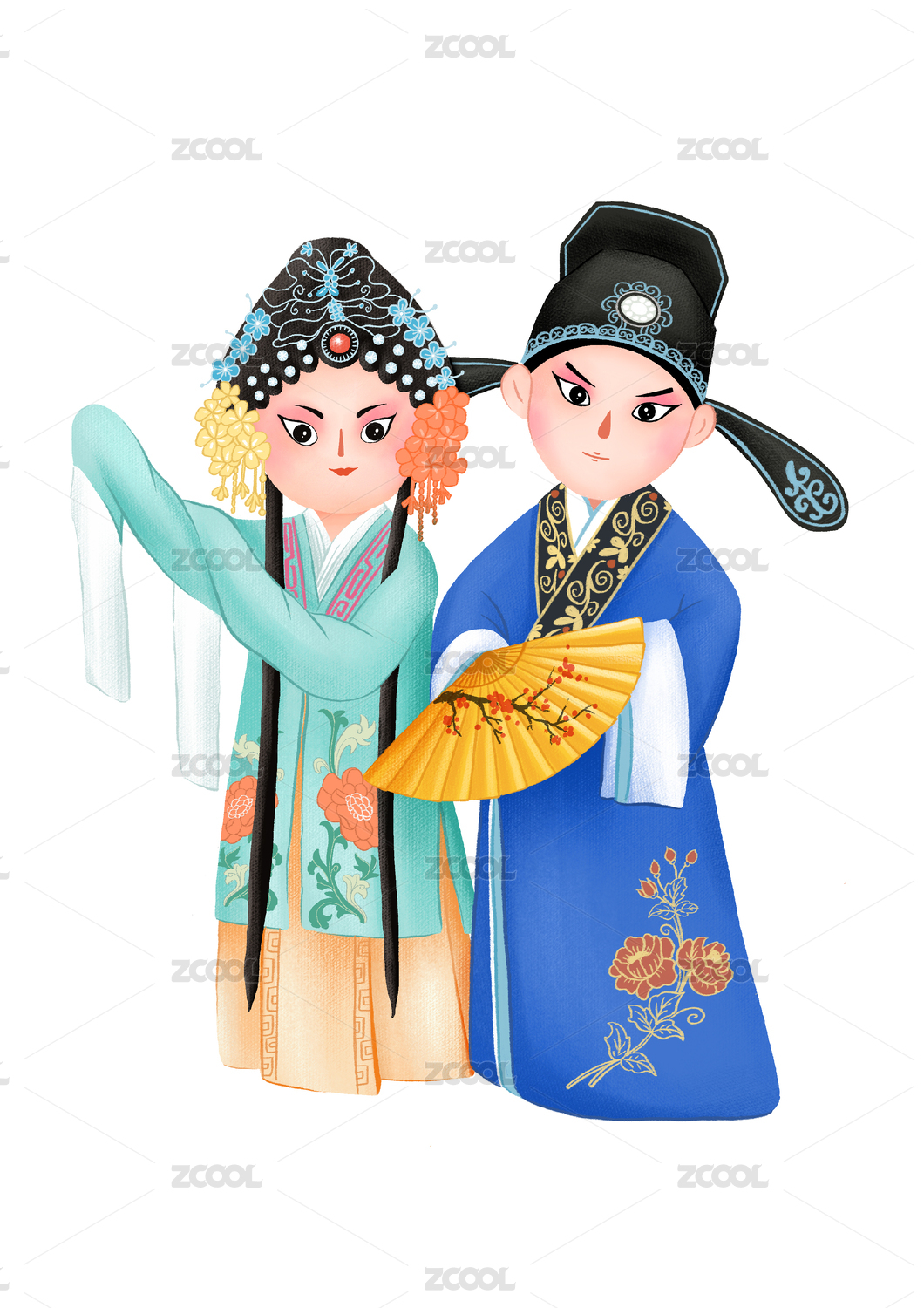 无背景的中国风可爱戏曲人物花旦和小生