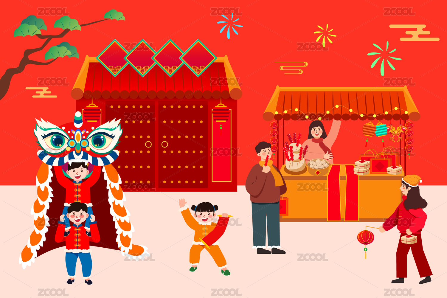 新年庙会集市矢量插画