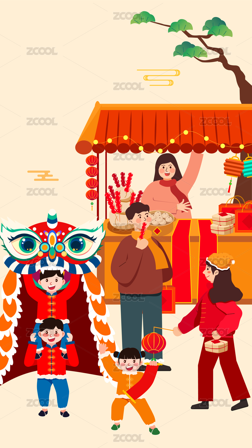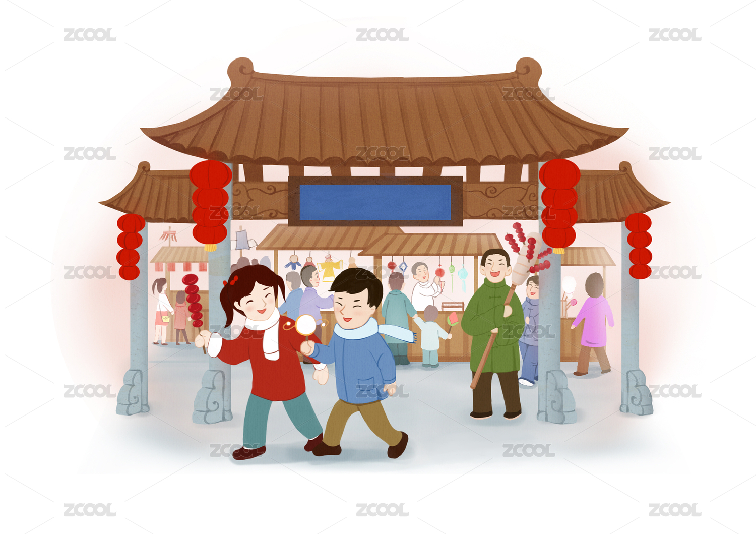 春节逛庙会插画