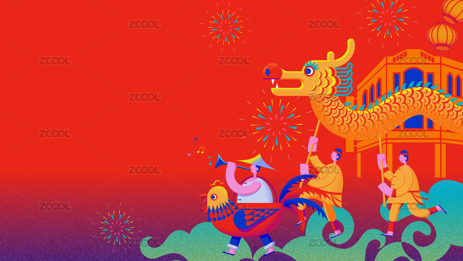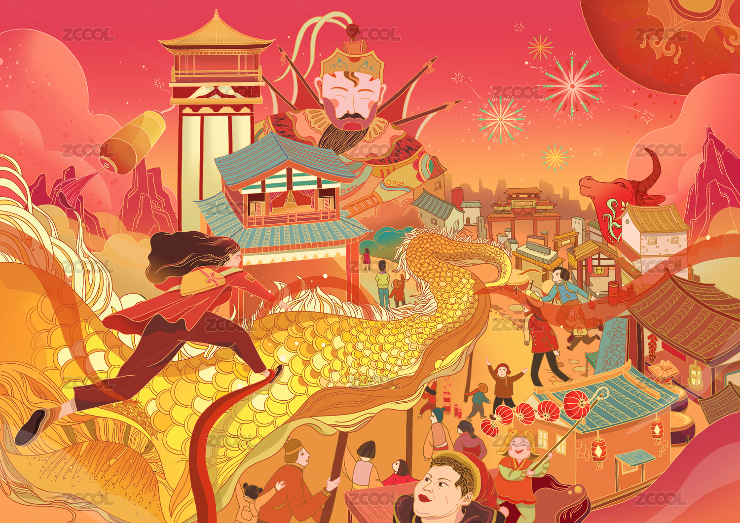 庙会巡游国潮插画