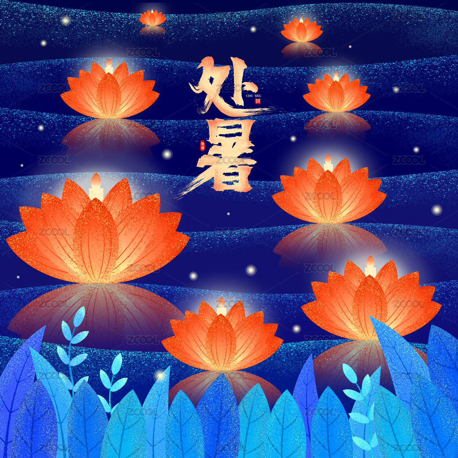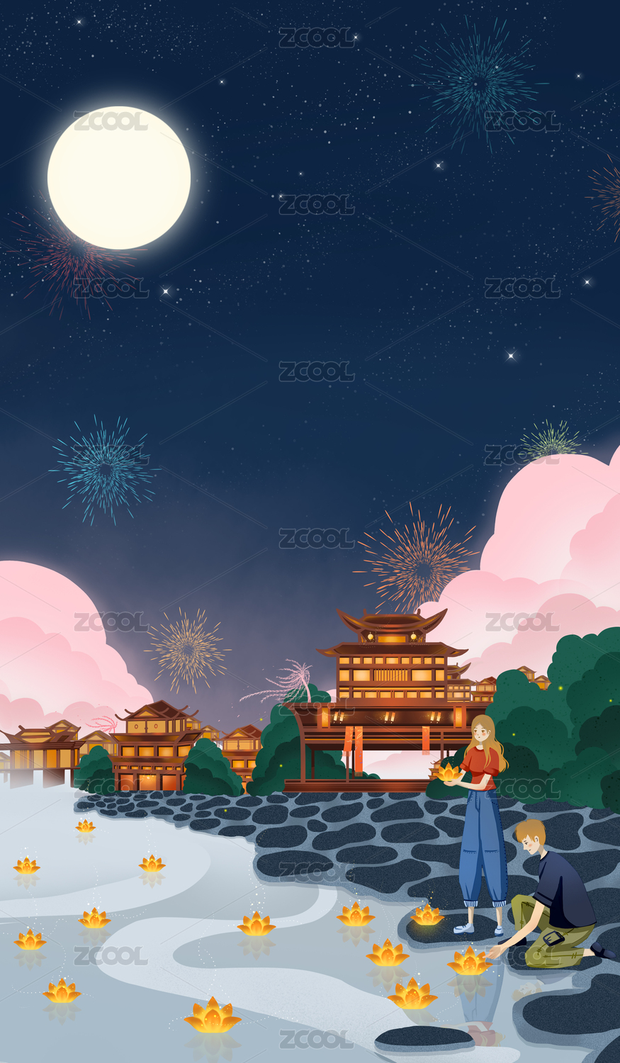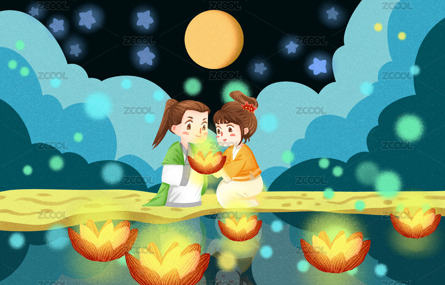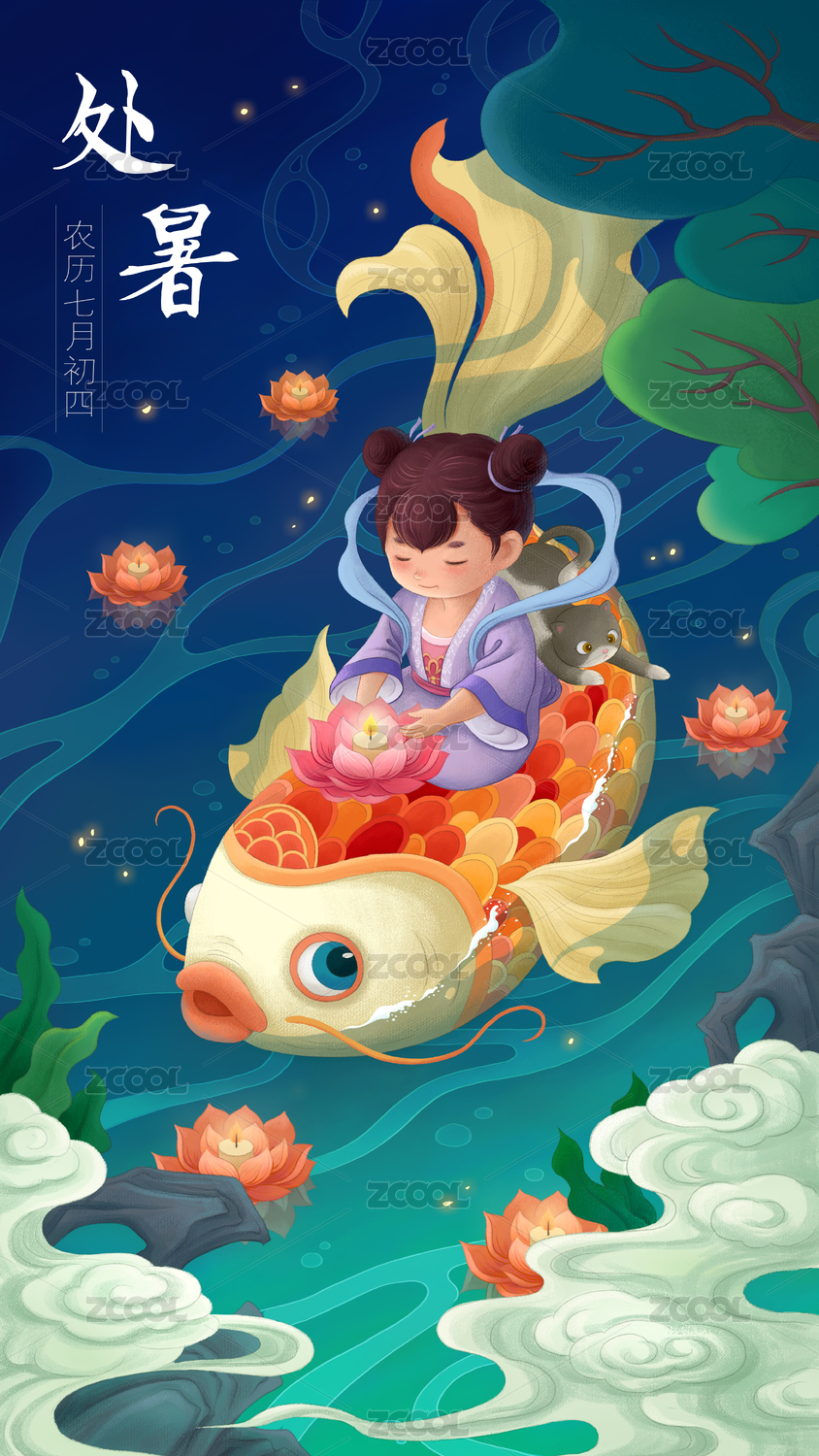 处暑节气紫衣小女孩坐在红色锦鲤上放河灯