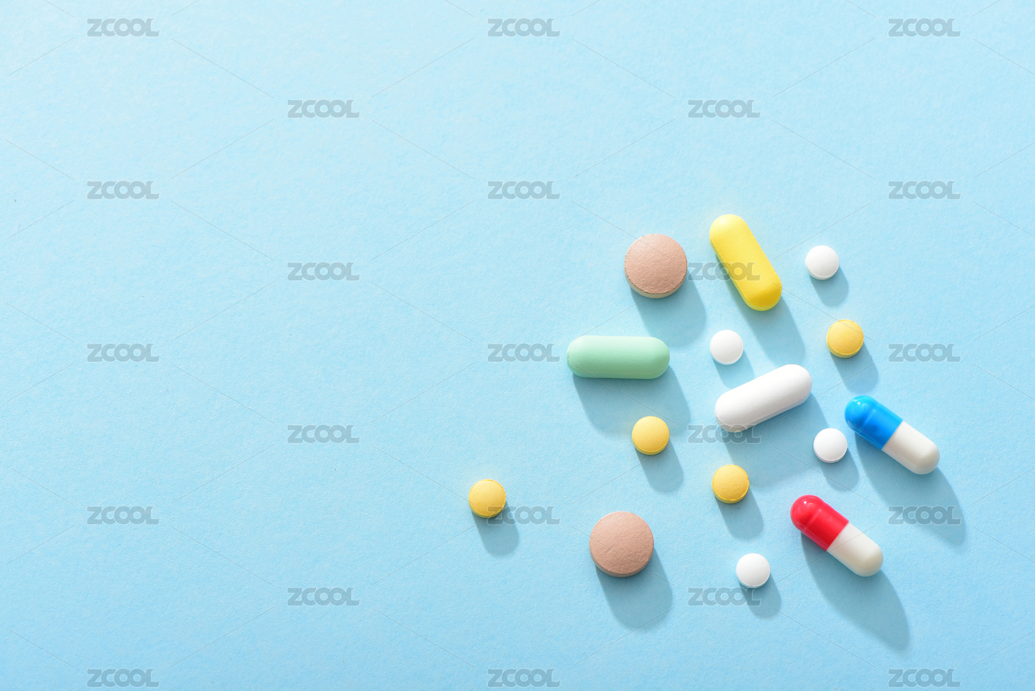蓝色背景上的各种药物——医疗健康