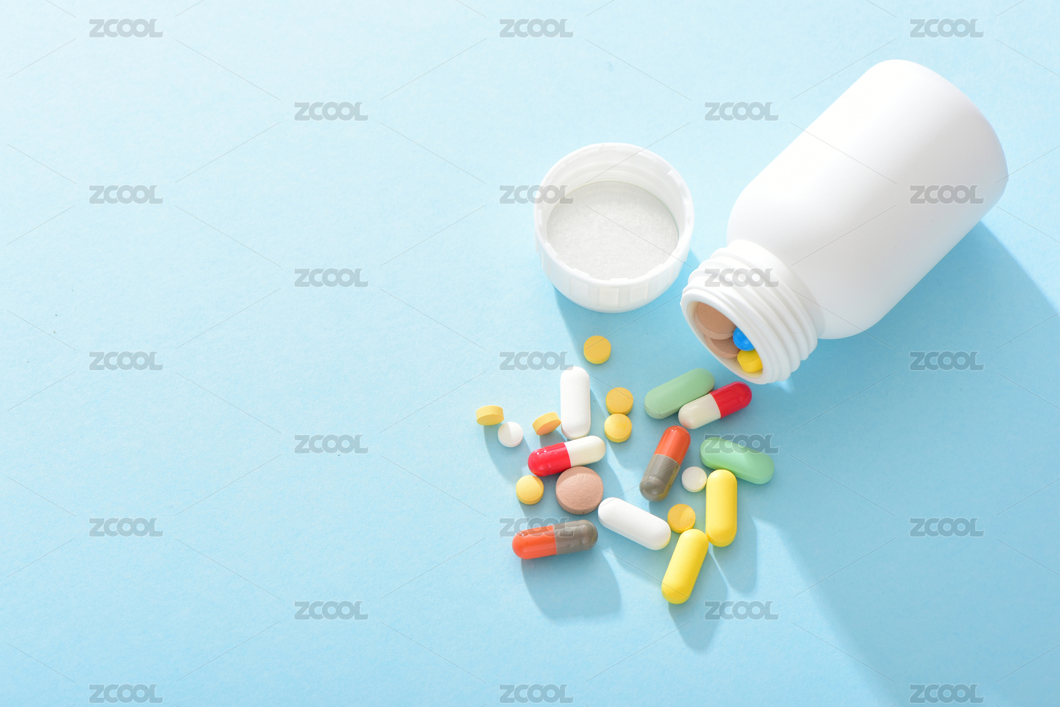 蓝色背景上从药瓶里倒出来的大量药物