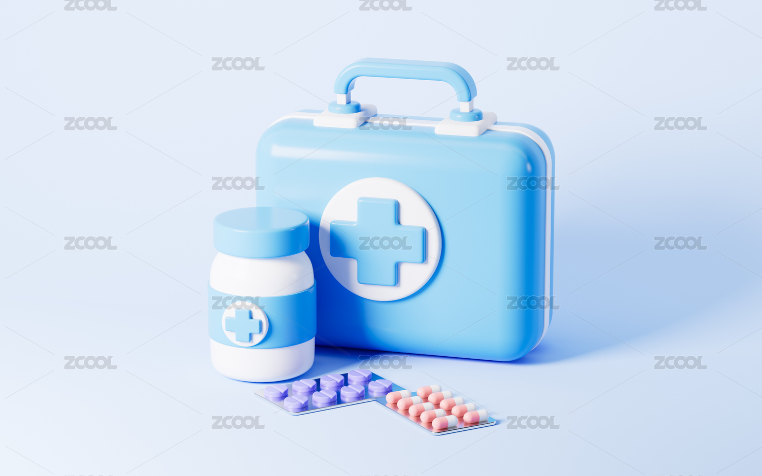 卡通药箱与药物3D渲染