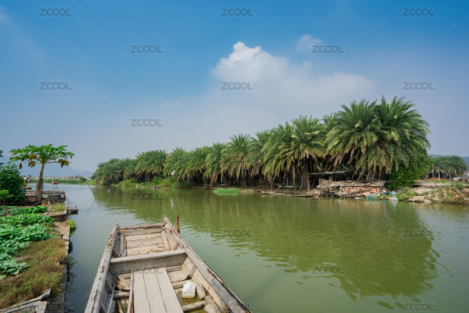 埭美环村河道上的木船及两岸的植被风光,中国福建漳州龙海