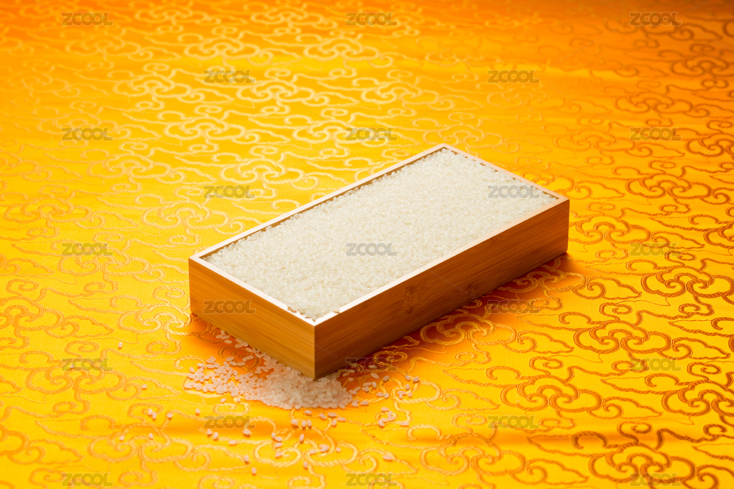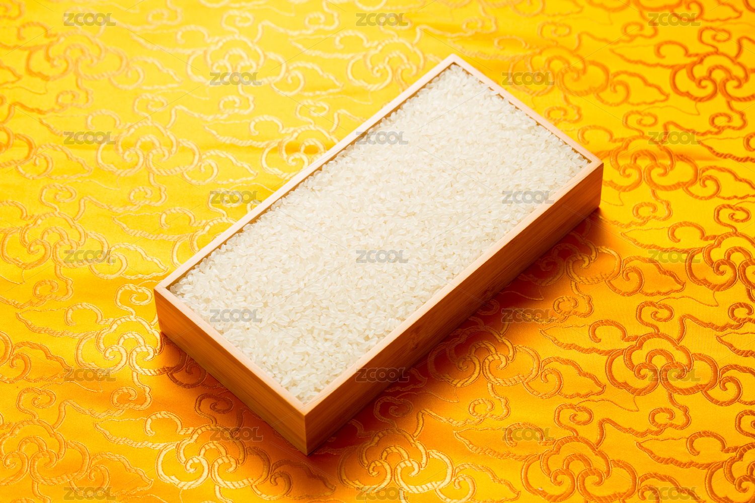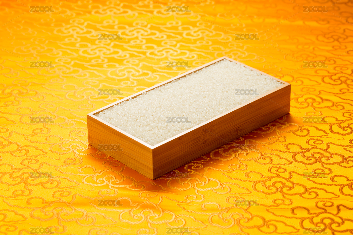 在黄色祥云绸缎背景上方木盒子里的白色大米