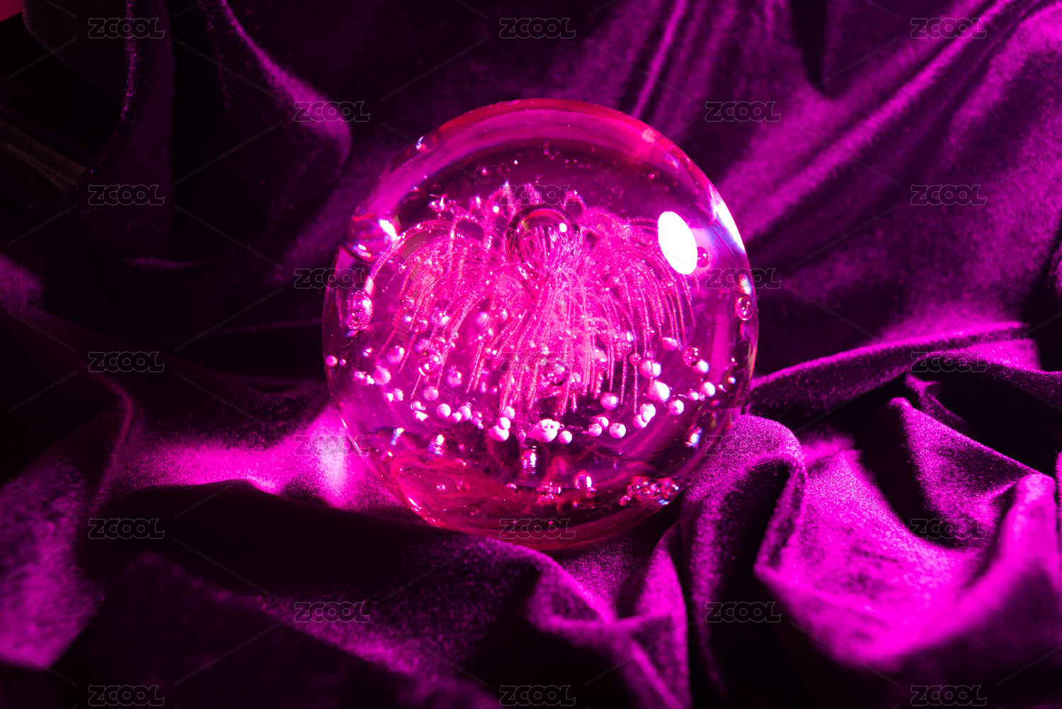紫红色玻璃球摆放在绸缎上
