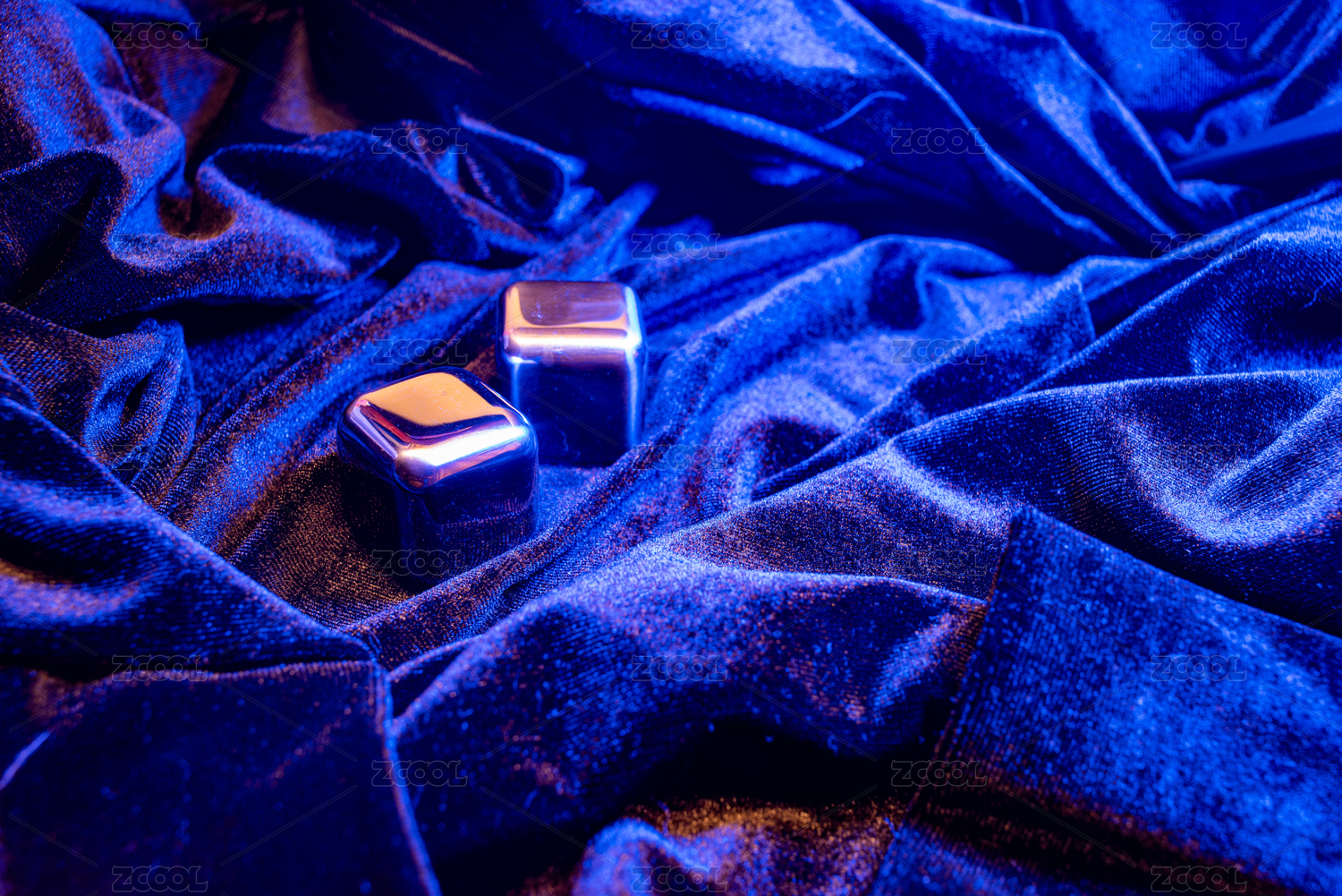 金属正方体摆放在绸缎上的蓝色背景照片