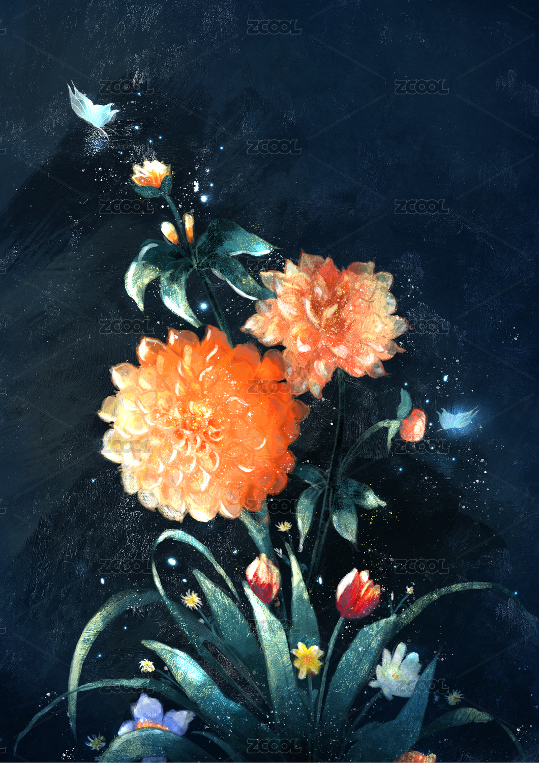 一簇蝴蝶围着的大丽花组合插画