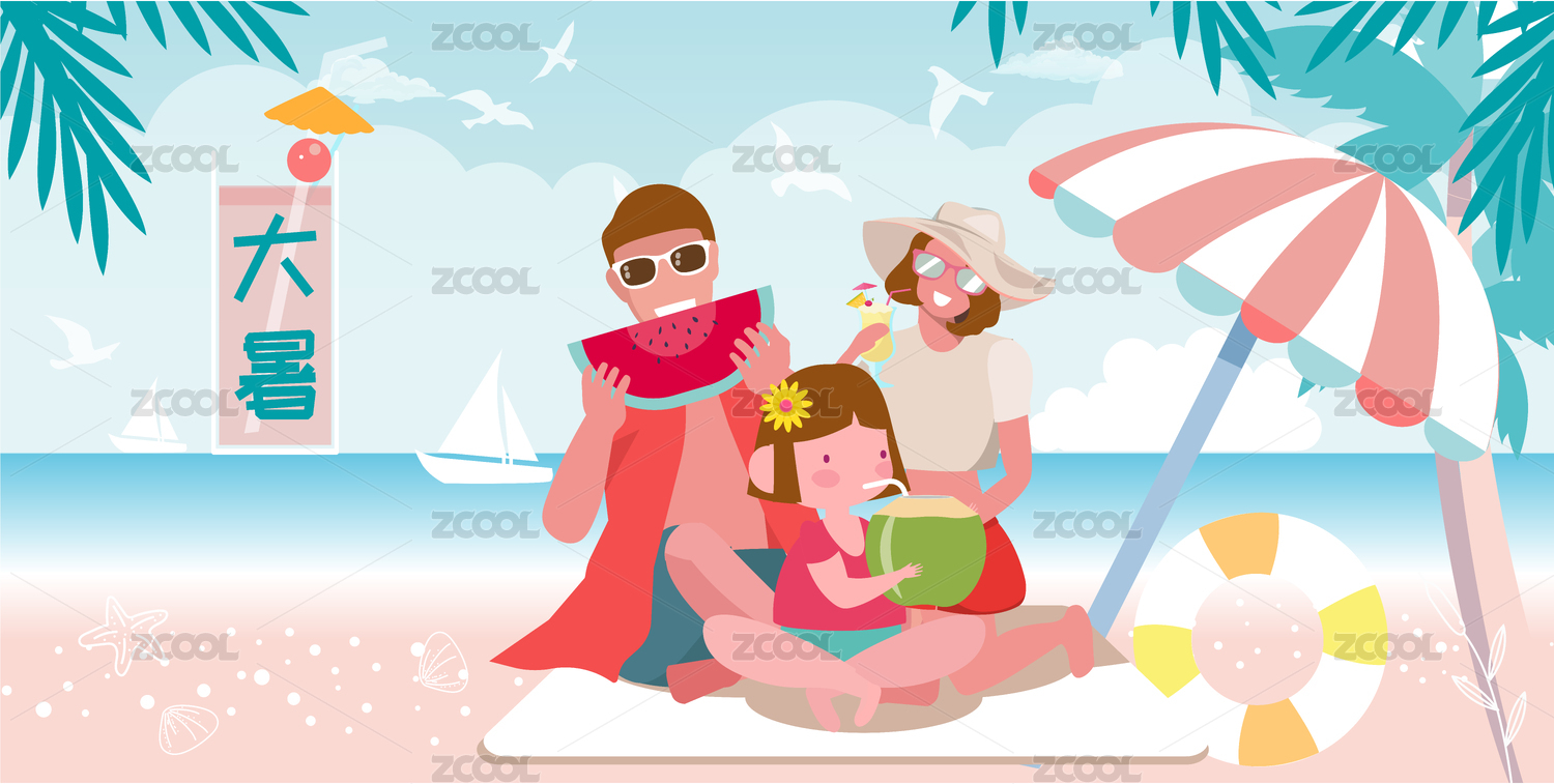 清凉夏日小暑大暑夏至海边度假吃瓜插画海报