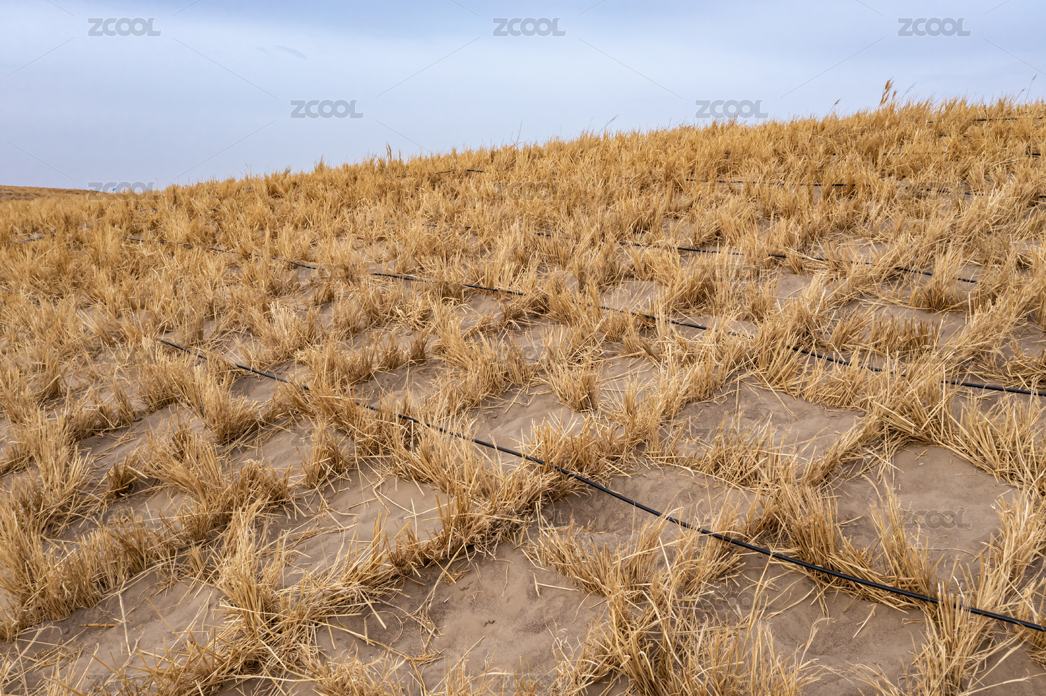 沙丘固沙治沙绿化草方格基坑滴灌带航拍