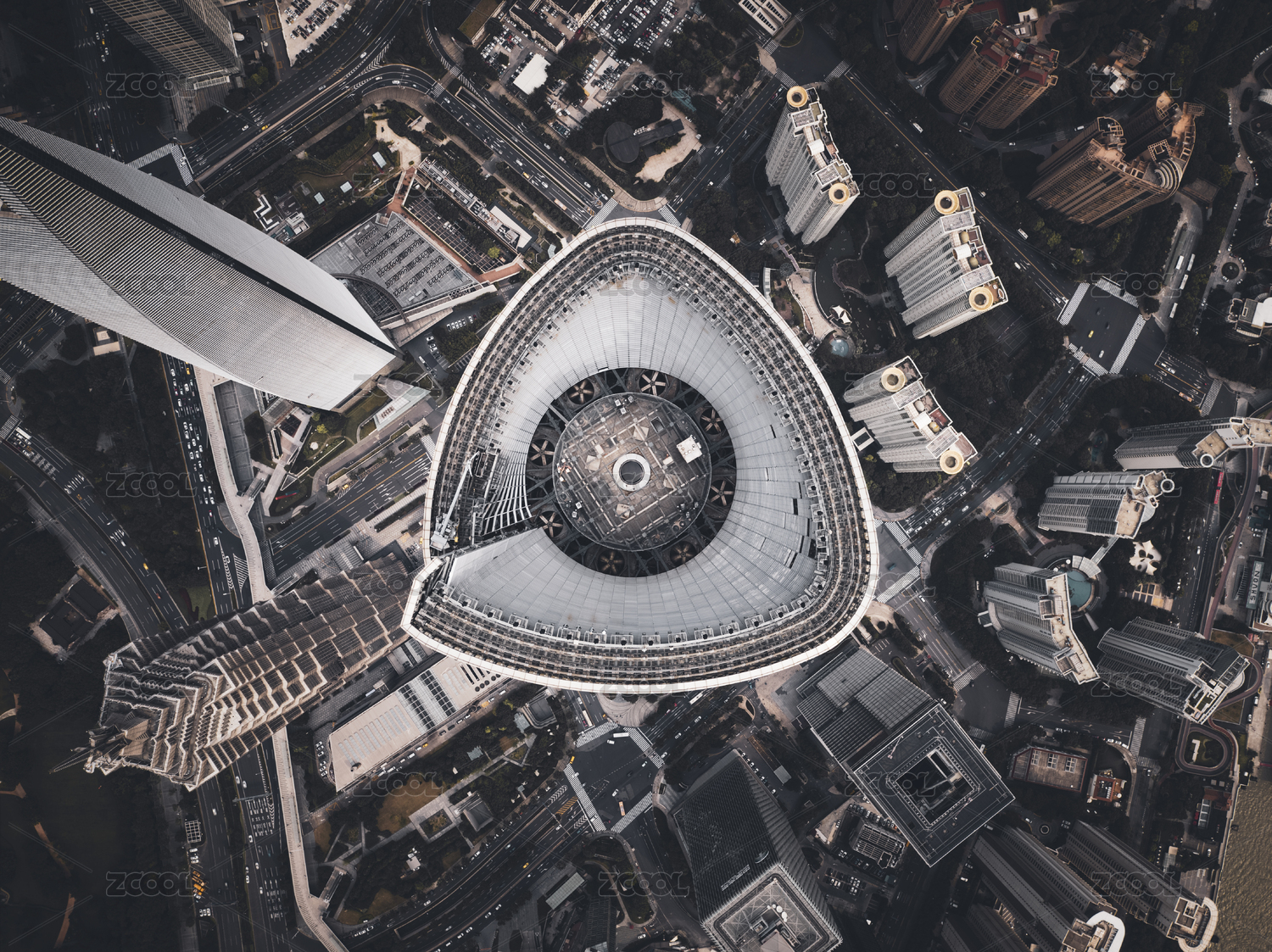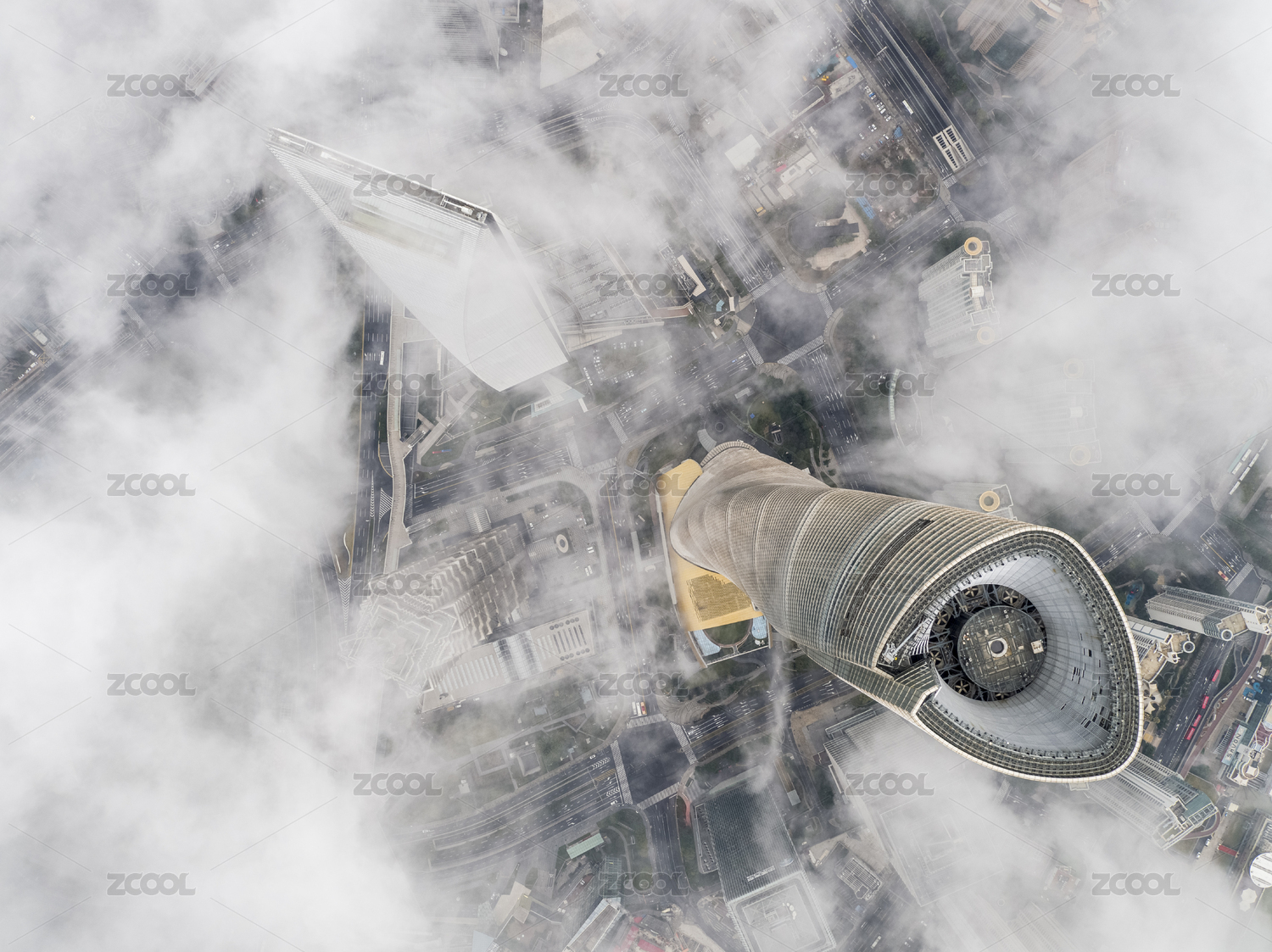 上帝视角垂直俯拍上海之巅上海中心大厦顶冠