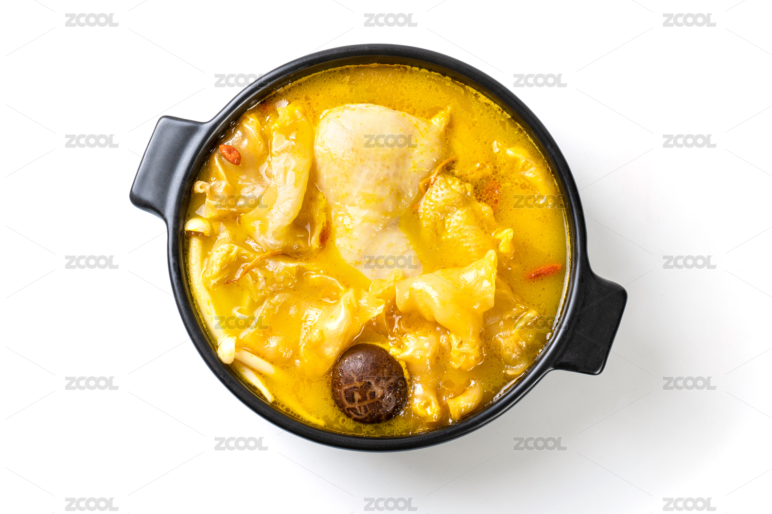 黑色背景上一个黑色砂锅里的鸡汤鱼肚