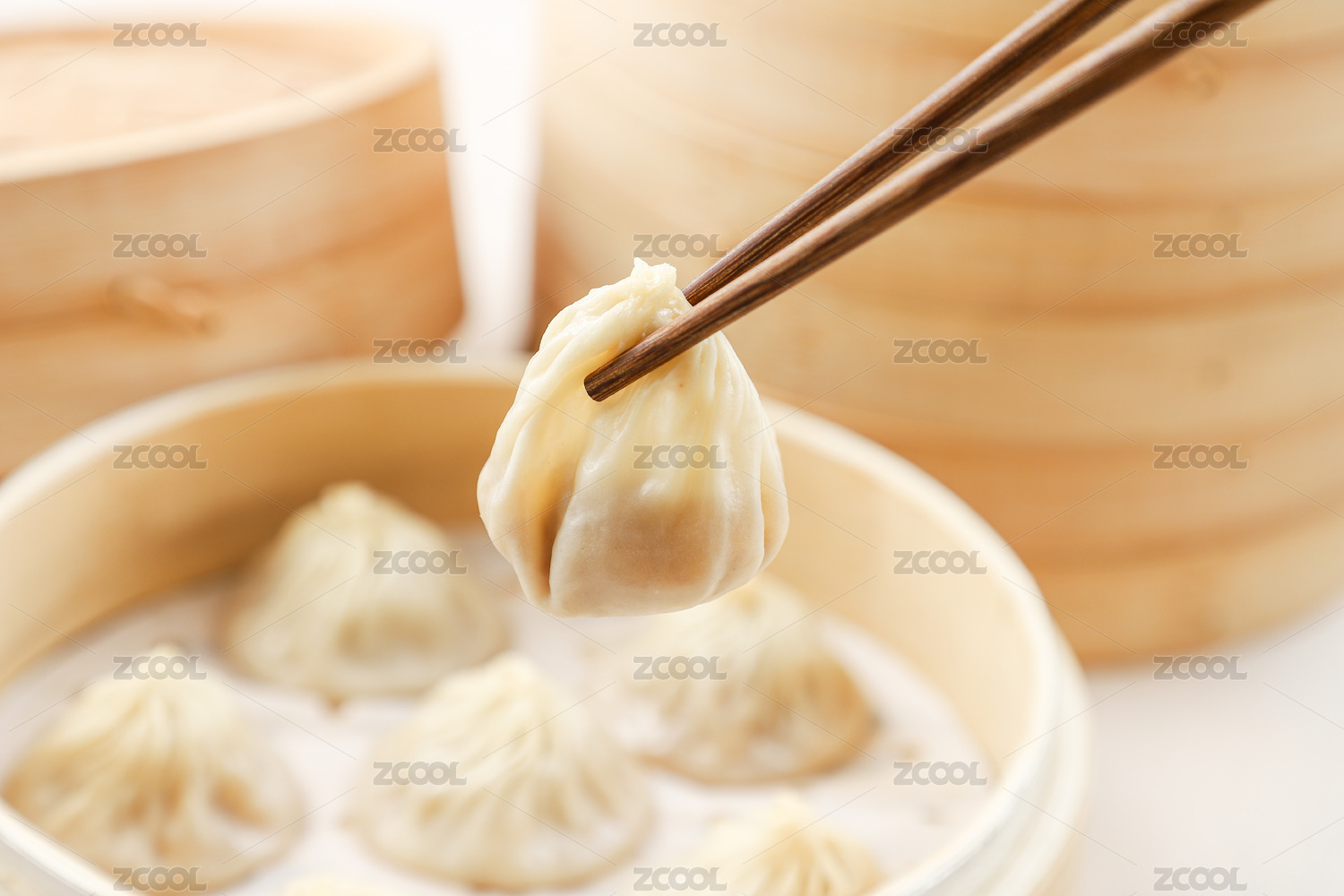 被筷子夹起的鲜肉小笼特写