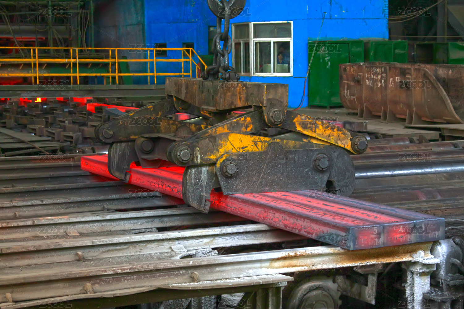 工业车间中吊装红热钢坯
