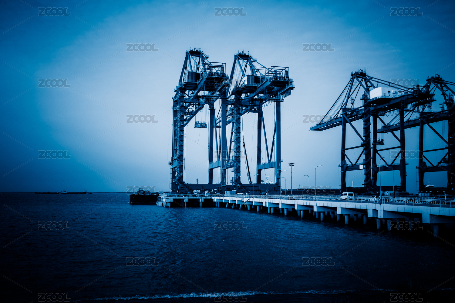 机械起重机在吊装码头运费,蓝色色调的图像。