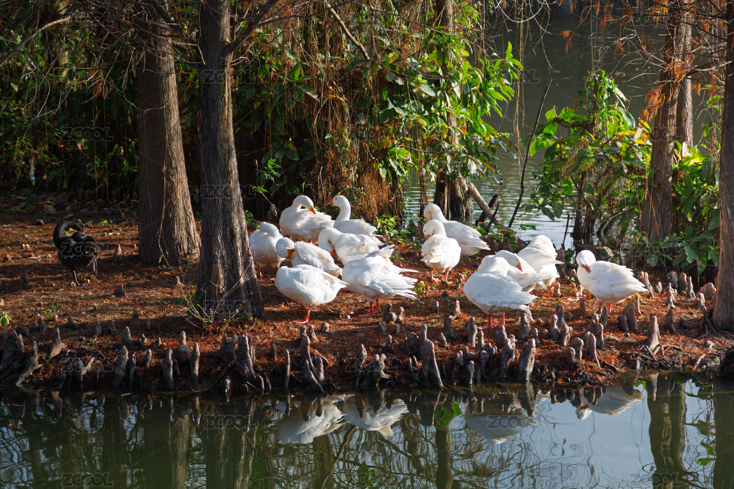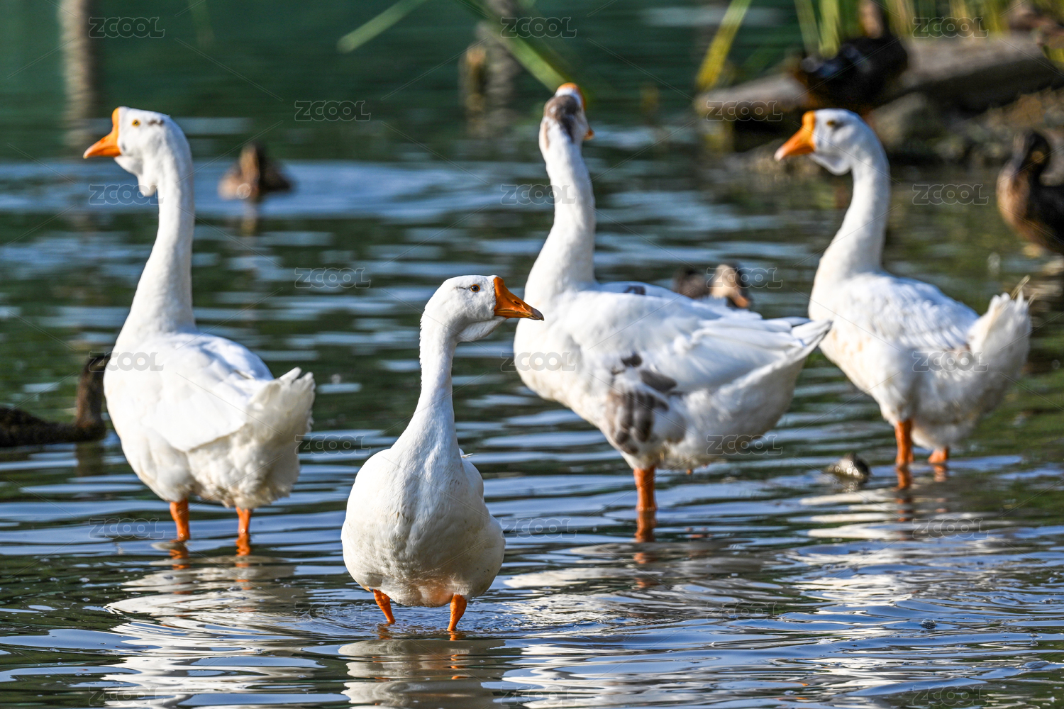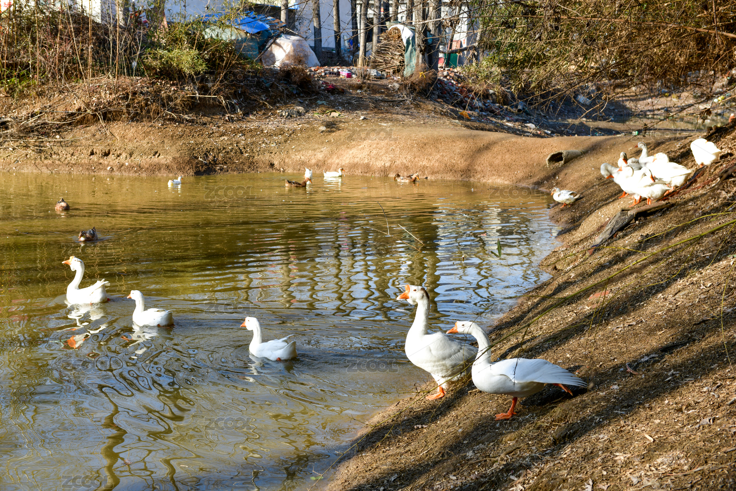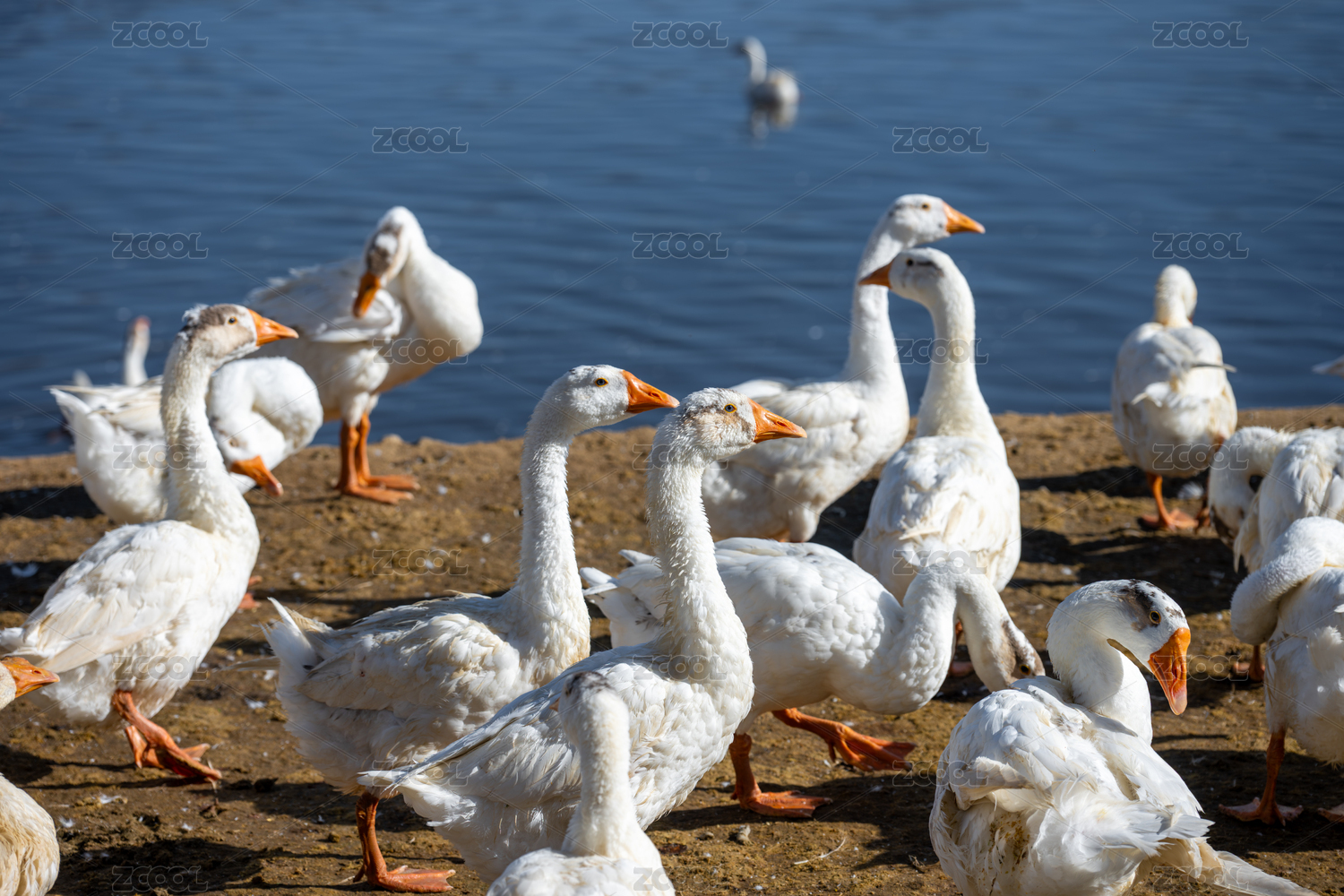 池塘边的白鹅群