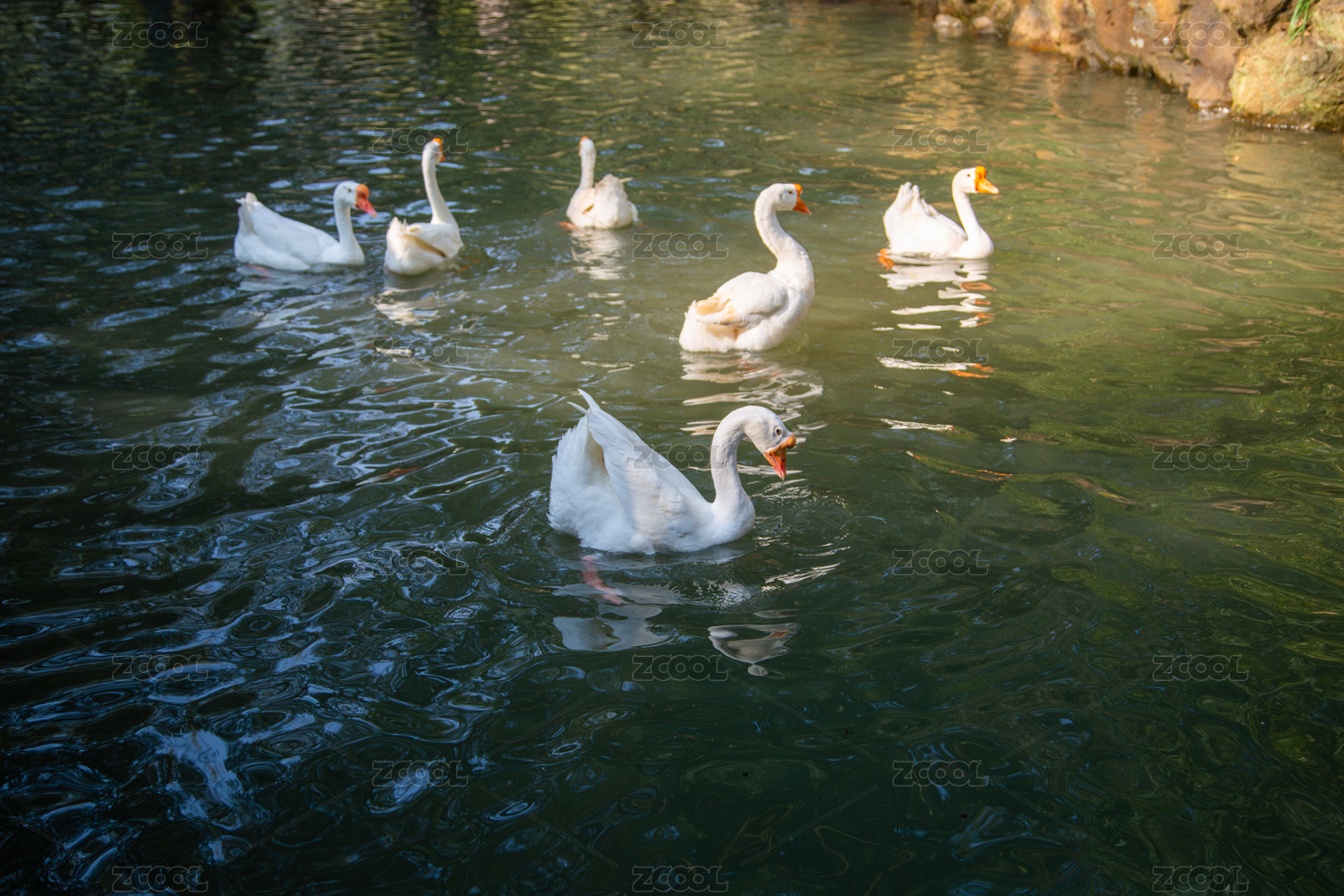 立夏时节阳光斑驳中一群在池水中戏水的白鹅