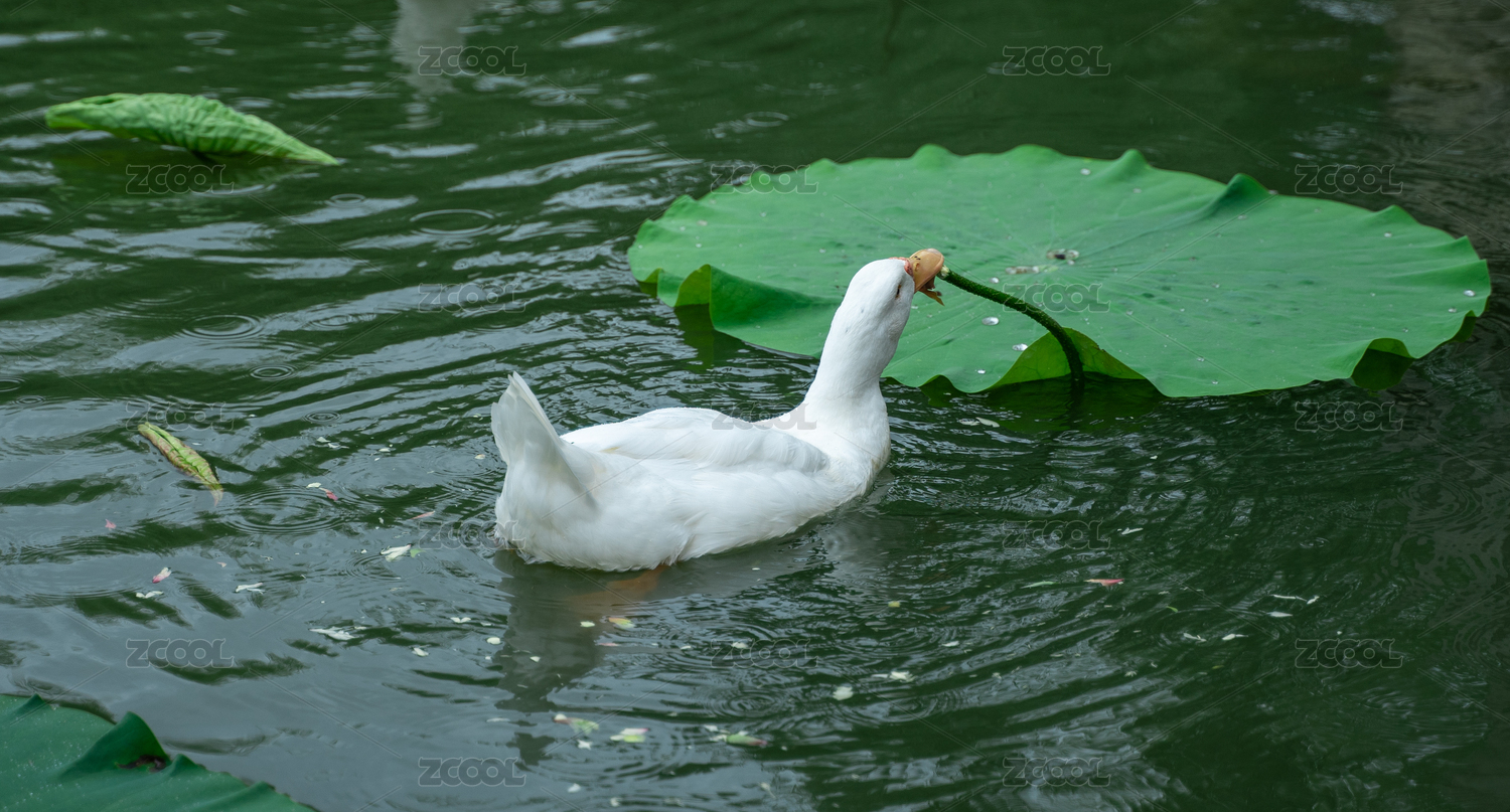 抓拍公园湖里白鹅吃荷花