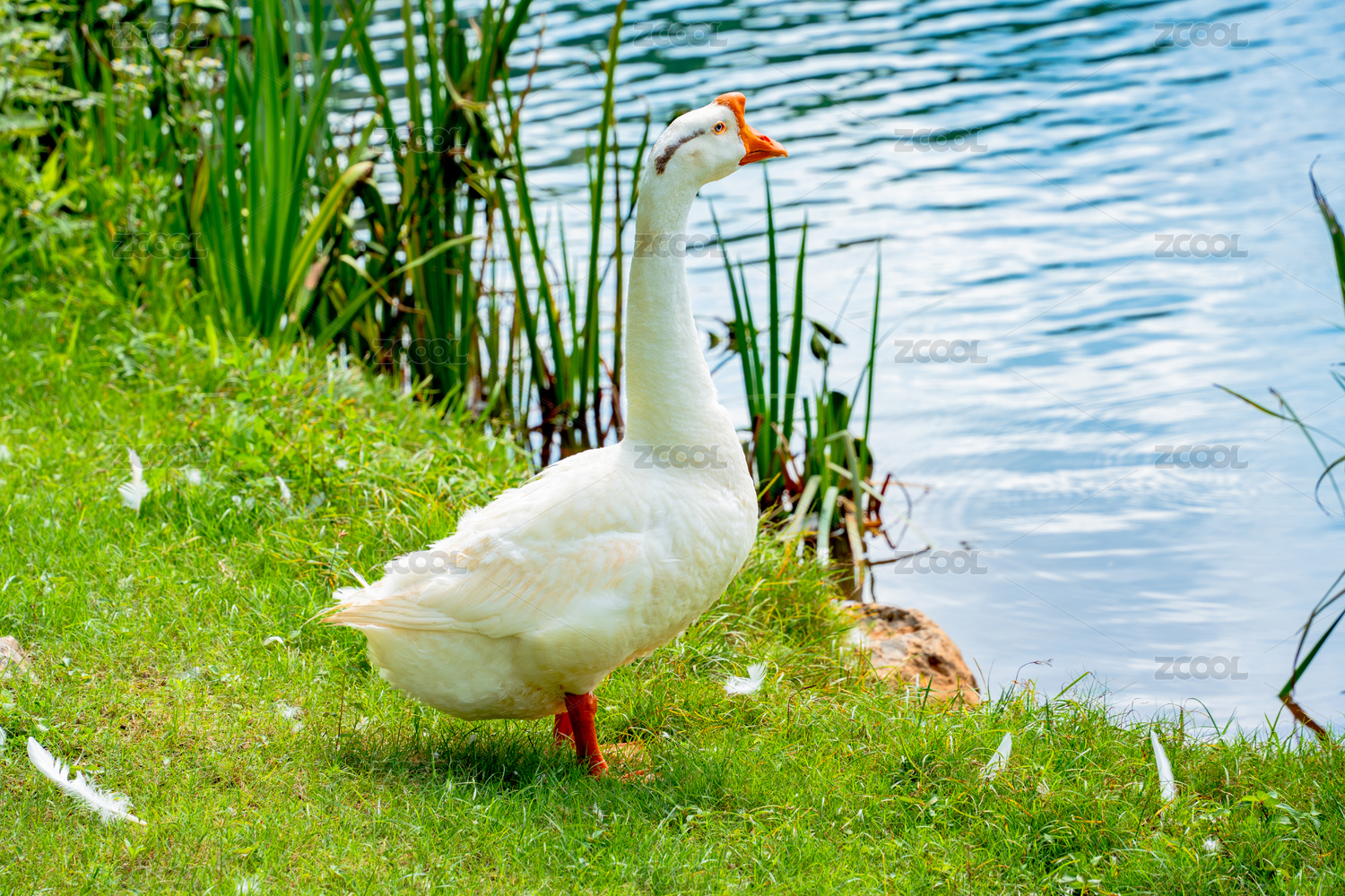 水边草地站立的白鹅