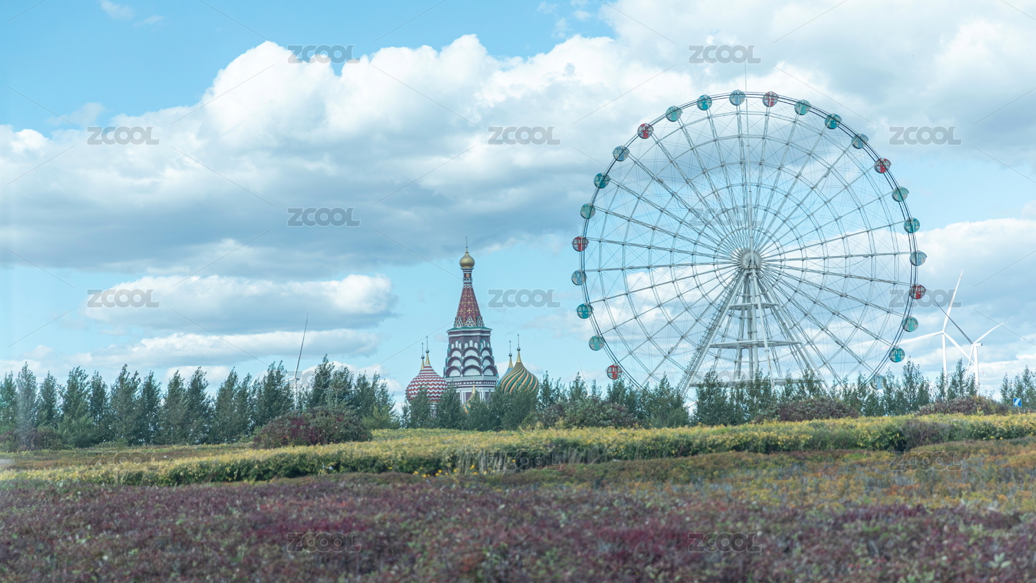 中国内蒙古满洲里蓝天白云映衬摩天轮
