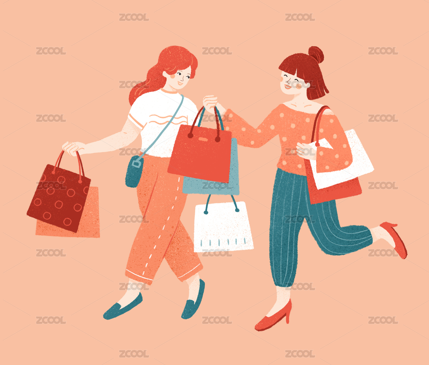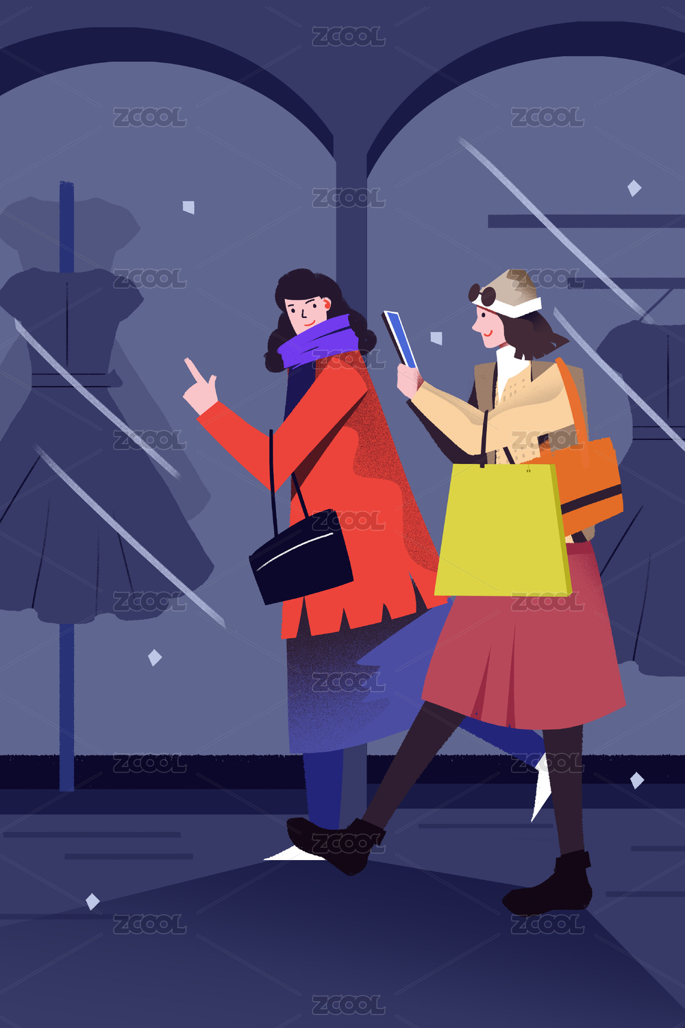 矢量女性购物插画,白色的背景女孩在讨论买东西