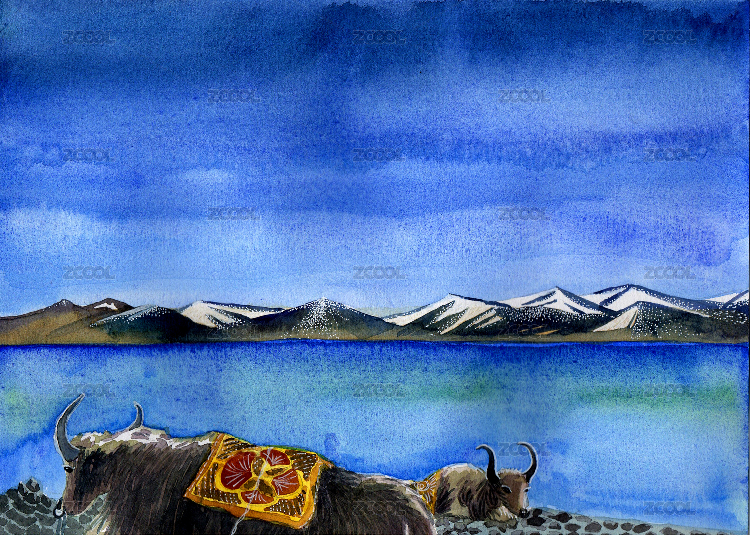 牦牛 西藏 咸水湖 雪山 纯净 肃穆 庄严 湖水 蓝天 寂静 深沉