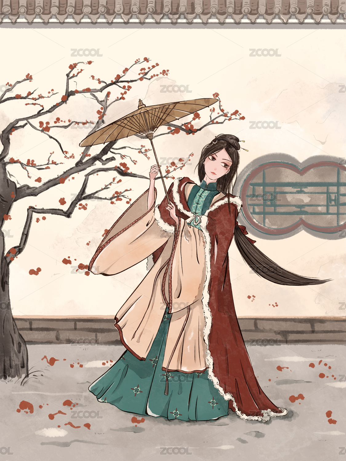 在梅花树旁边撑着伞的古风少女