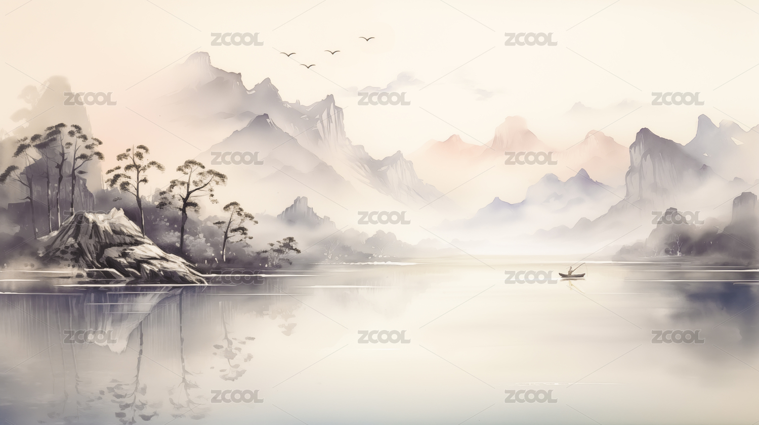 水彩风格写意山水画,山峰倒影渔船