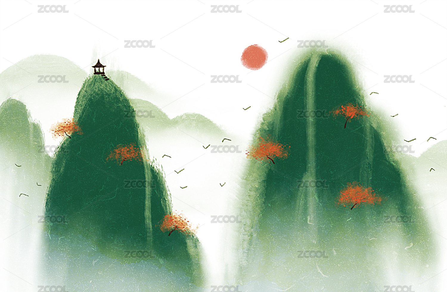 水彩风格写意山水画,山峦落日凉亭