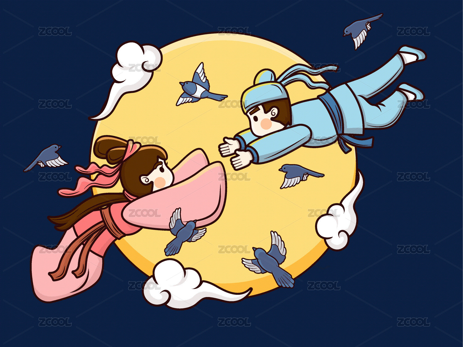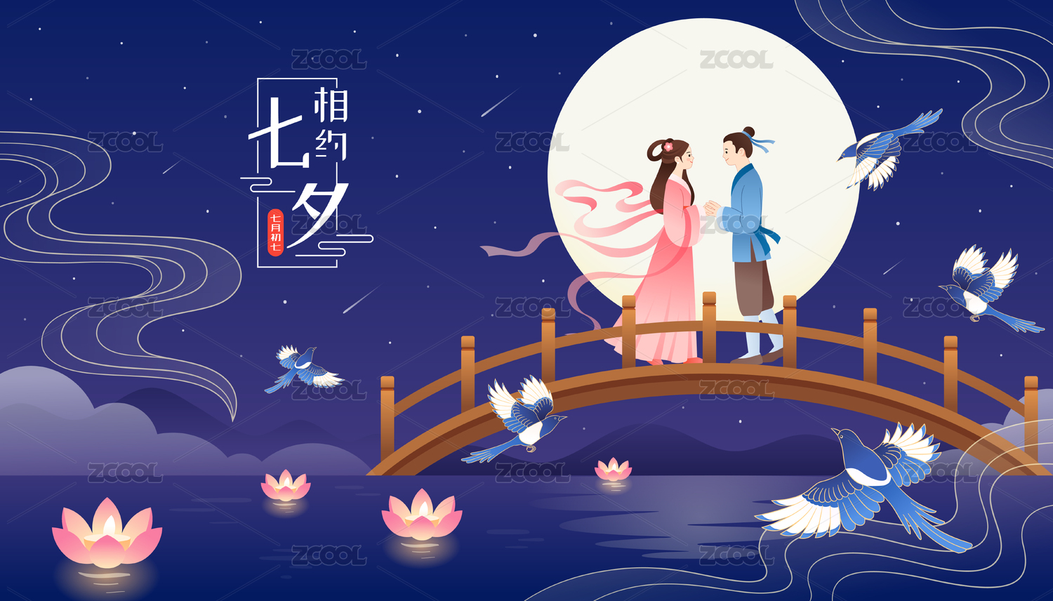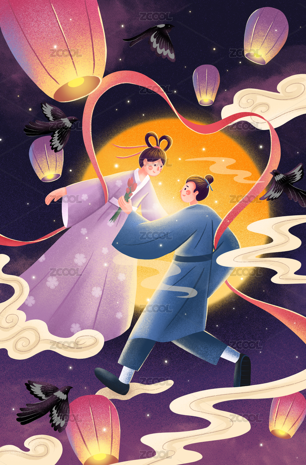 牛郎织女七夕月下相会新中国风手绘插画