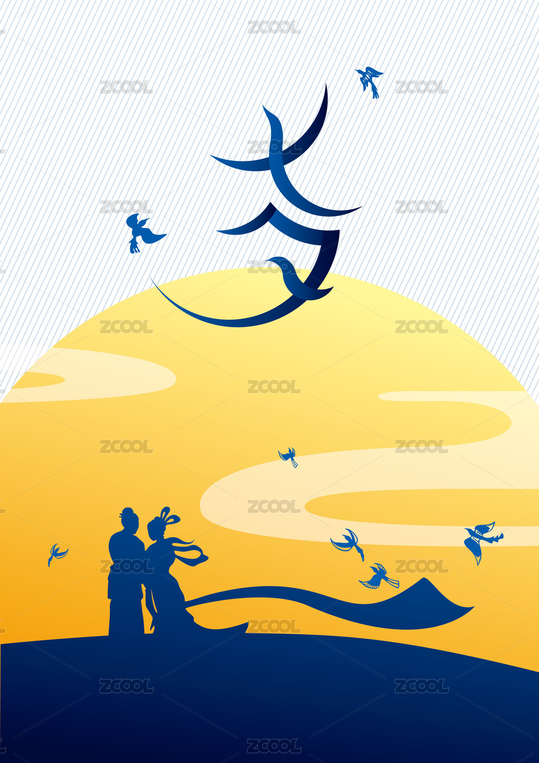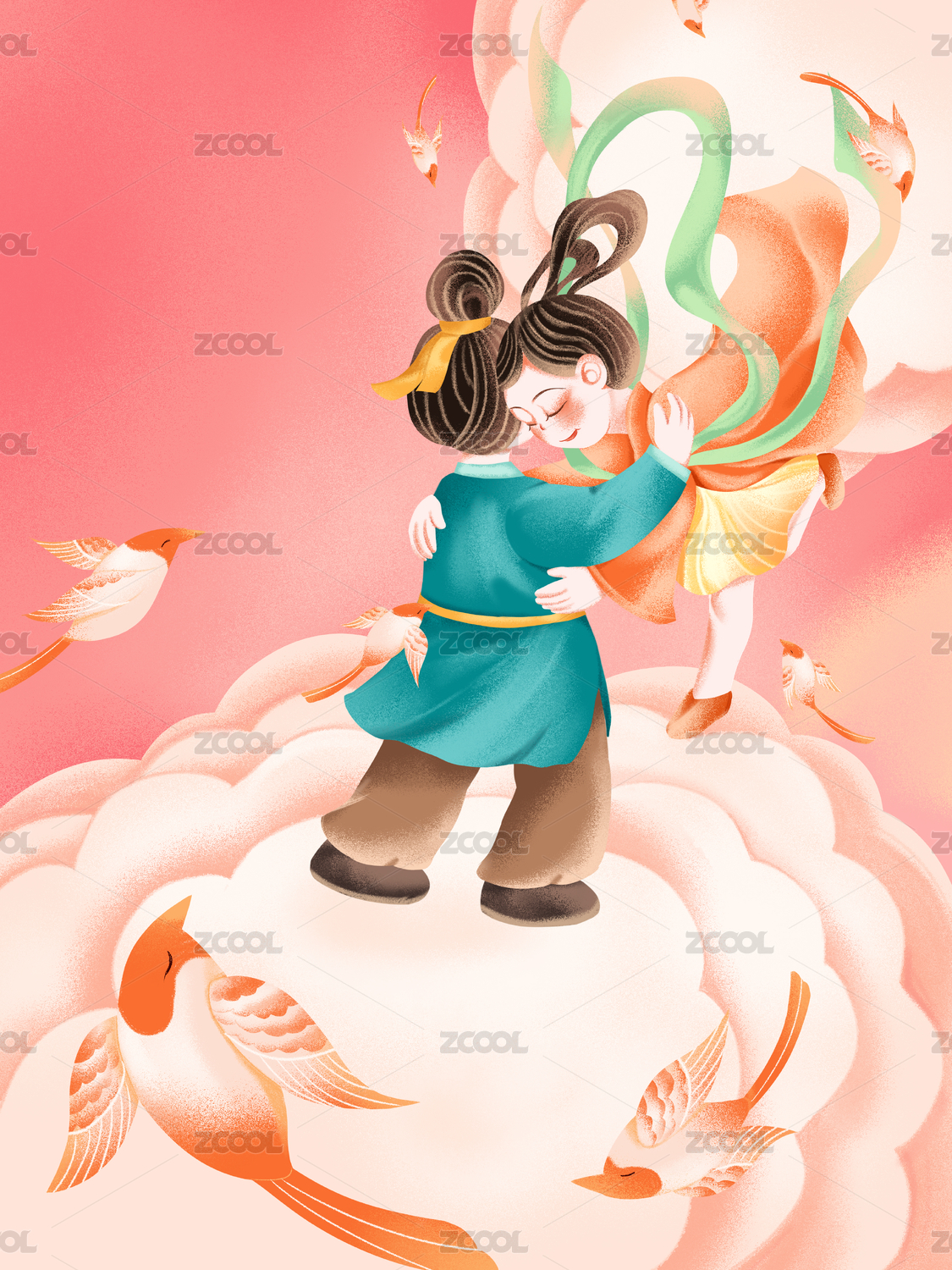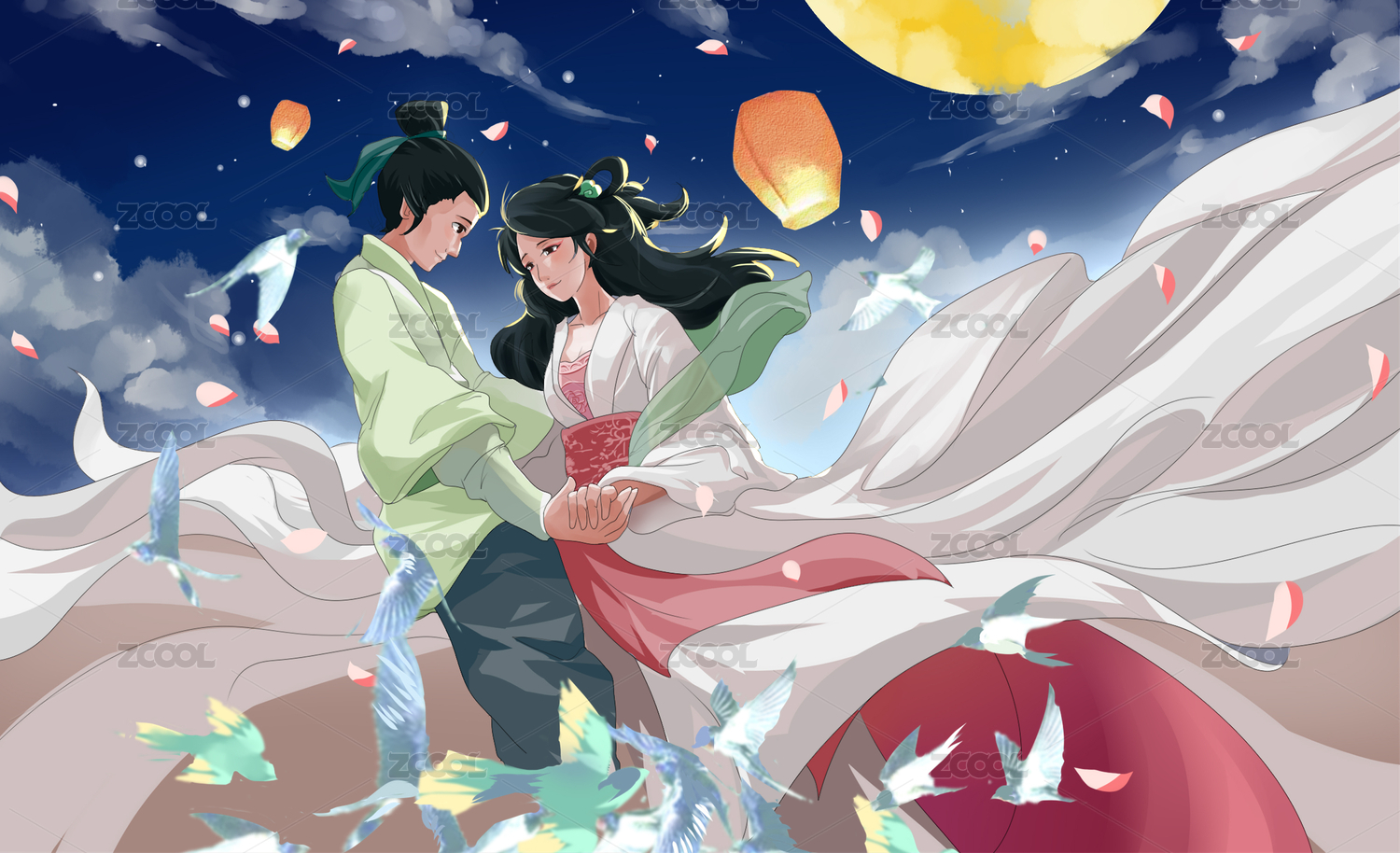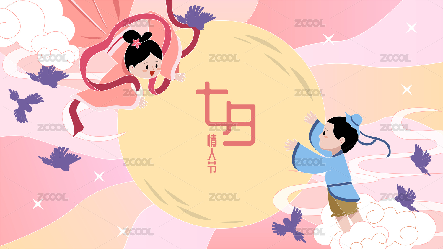 牛郎织女七夕月下相会新中国风手绘插画
