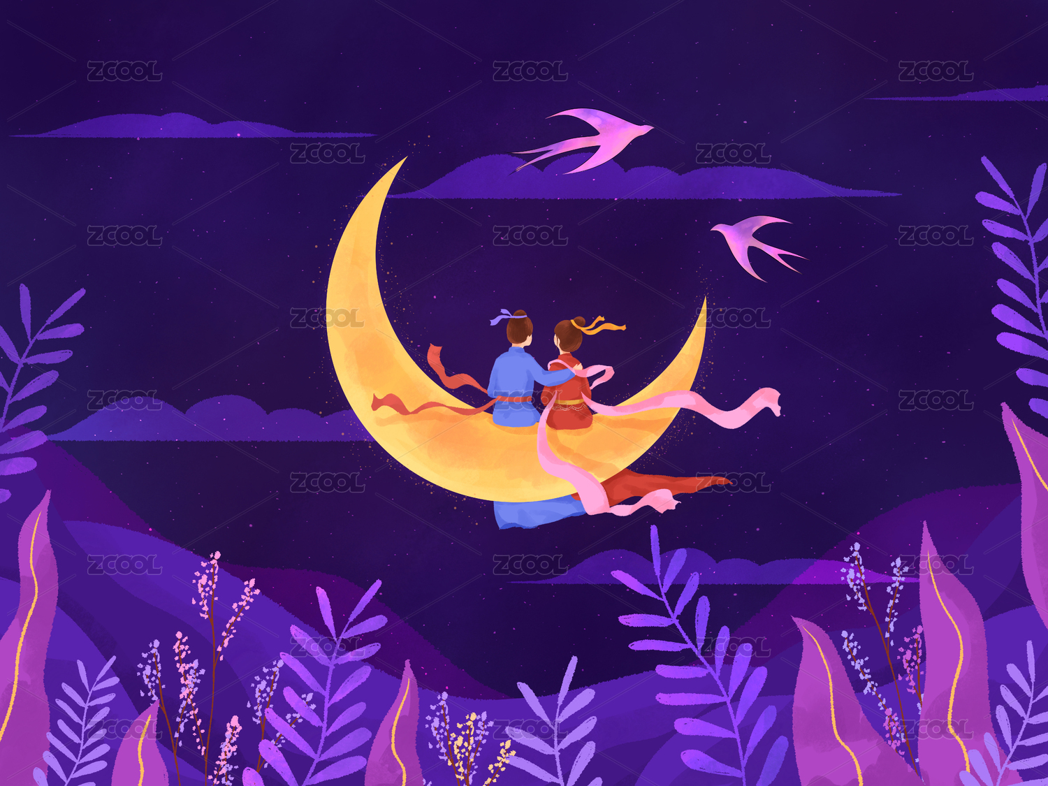 紫色夜晚月亮七夕相会插画