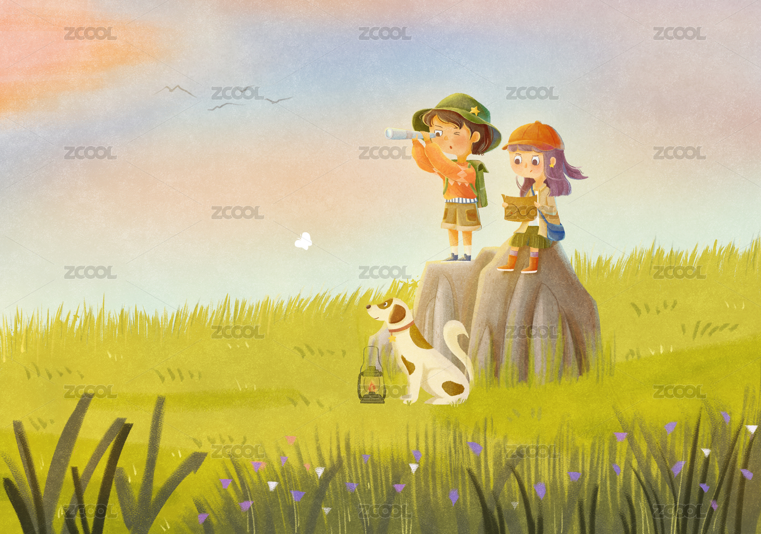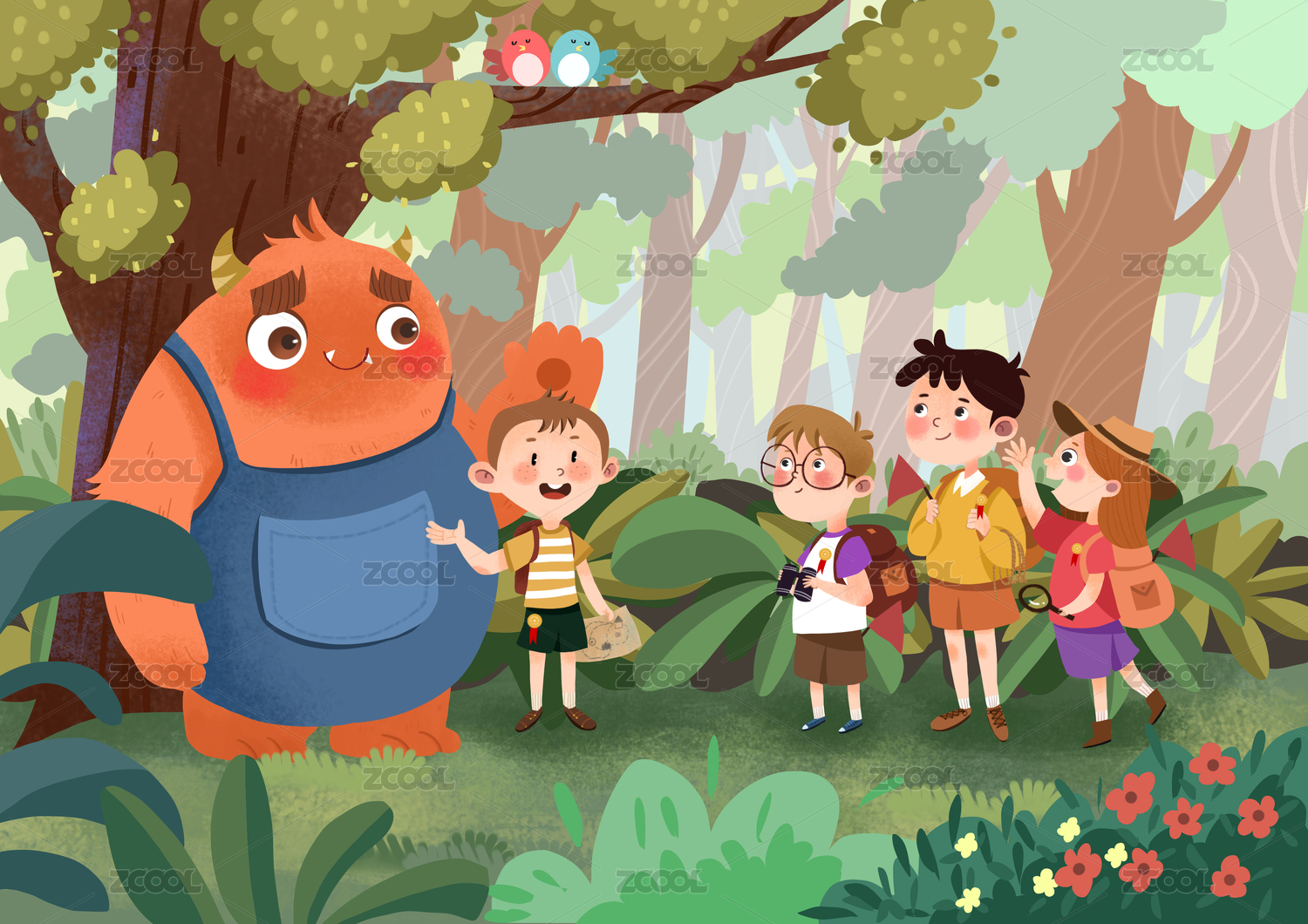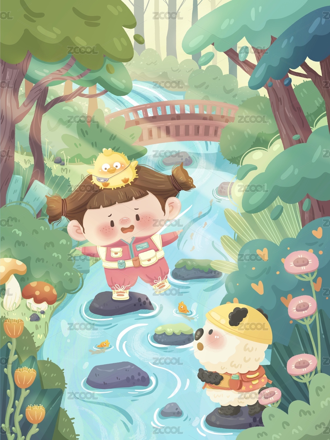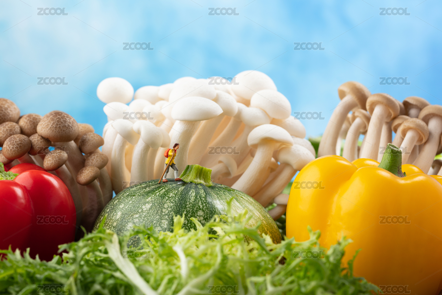 各类蔬菜鲜艳色彩蘑菇森林探险的旅行者