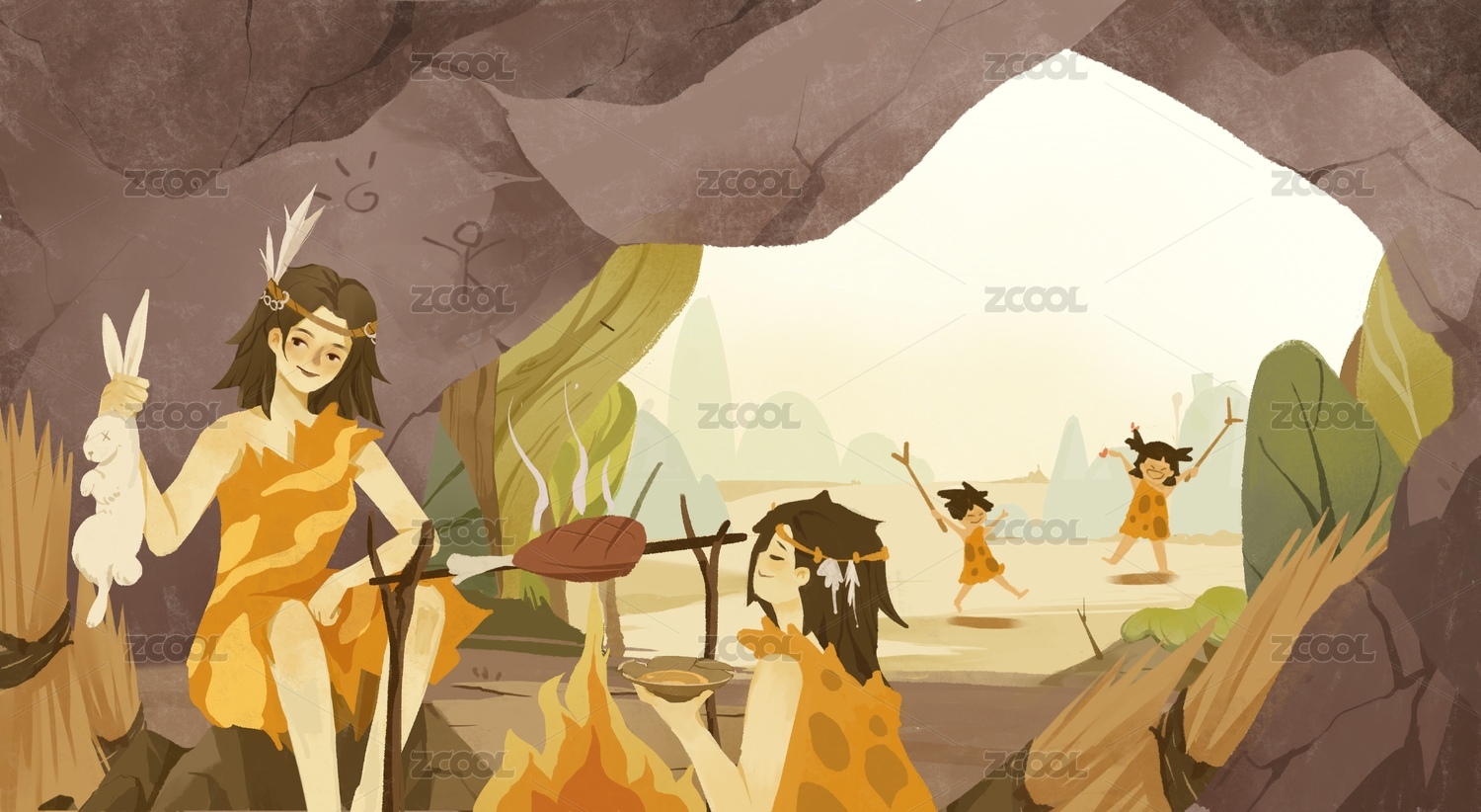 森林自然山洞原始人打猎场景插画