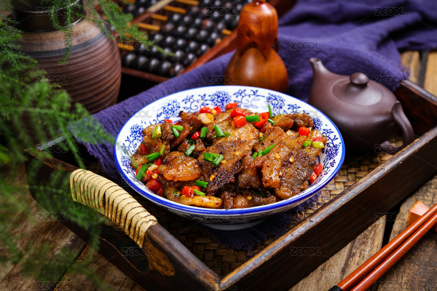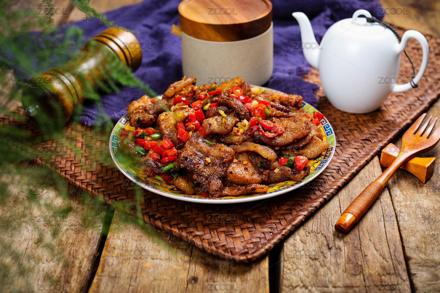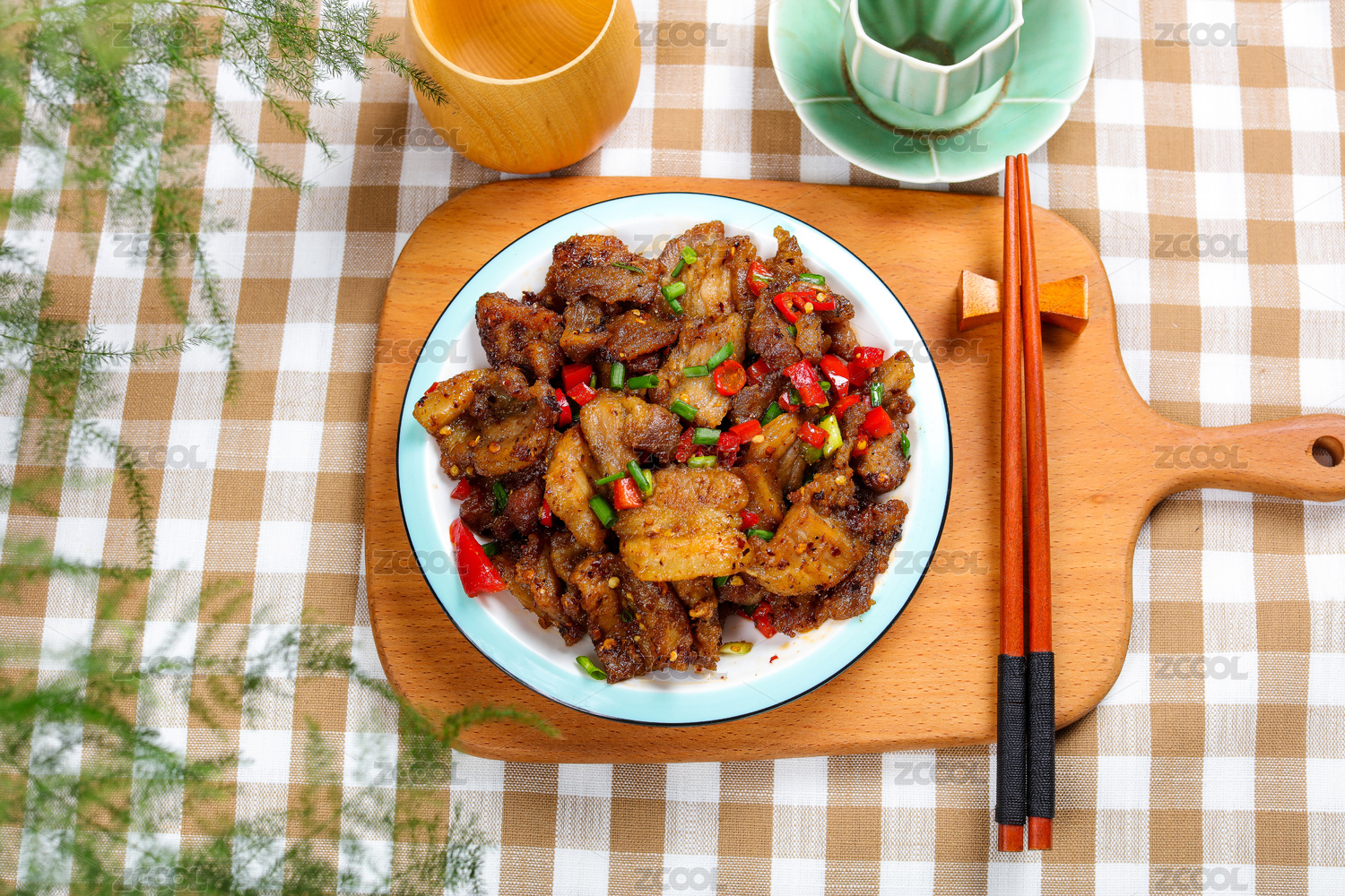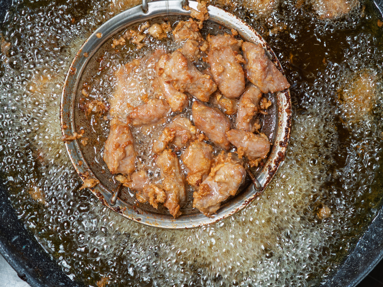 用漏勺从滚烫的热油中捞出刚刚炸好的猪肉块