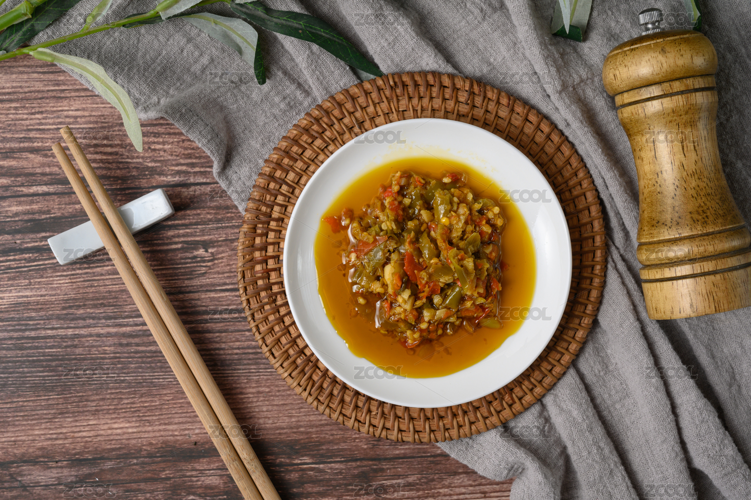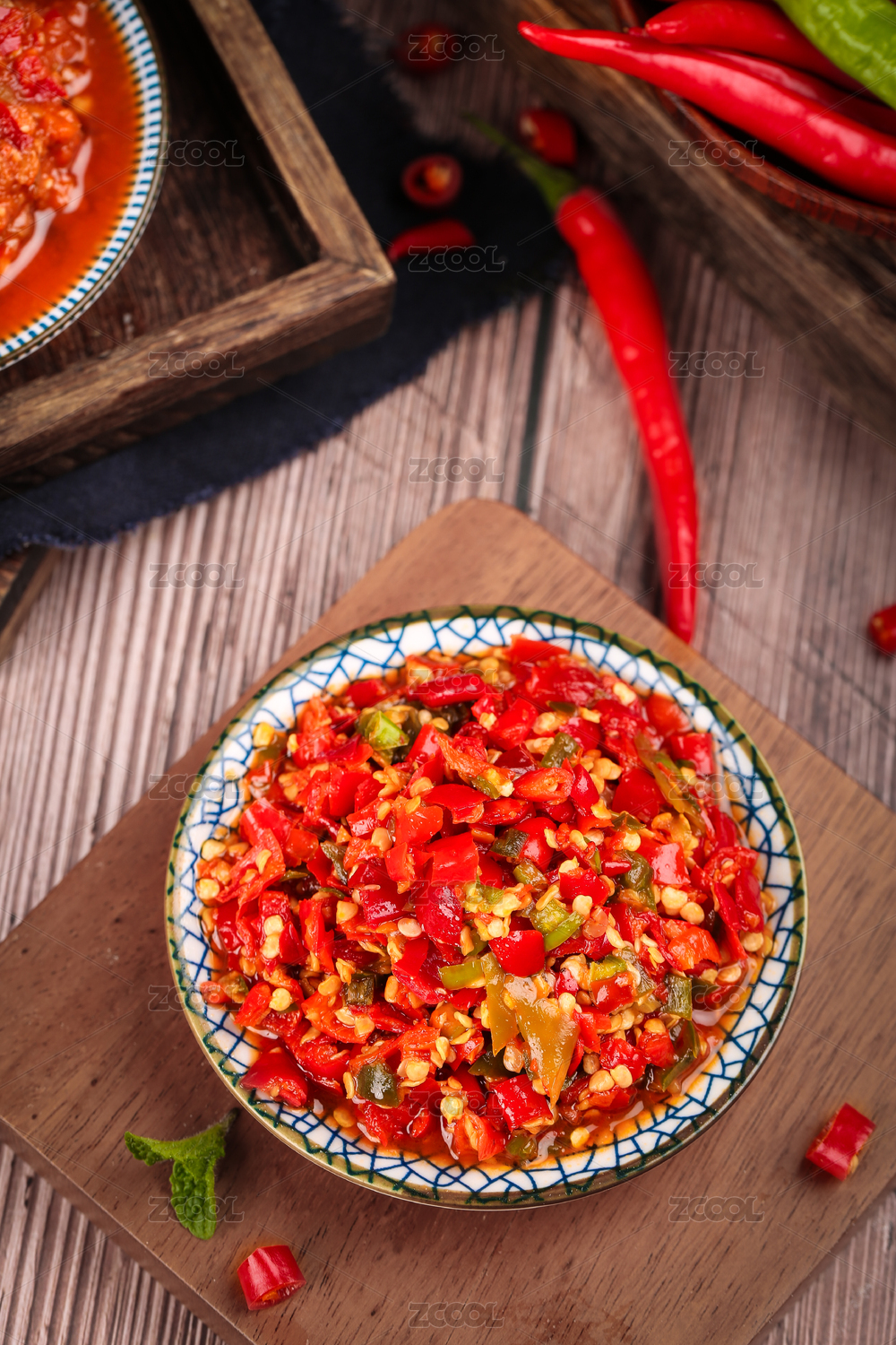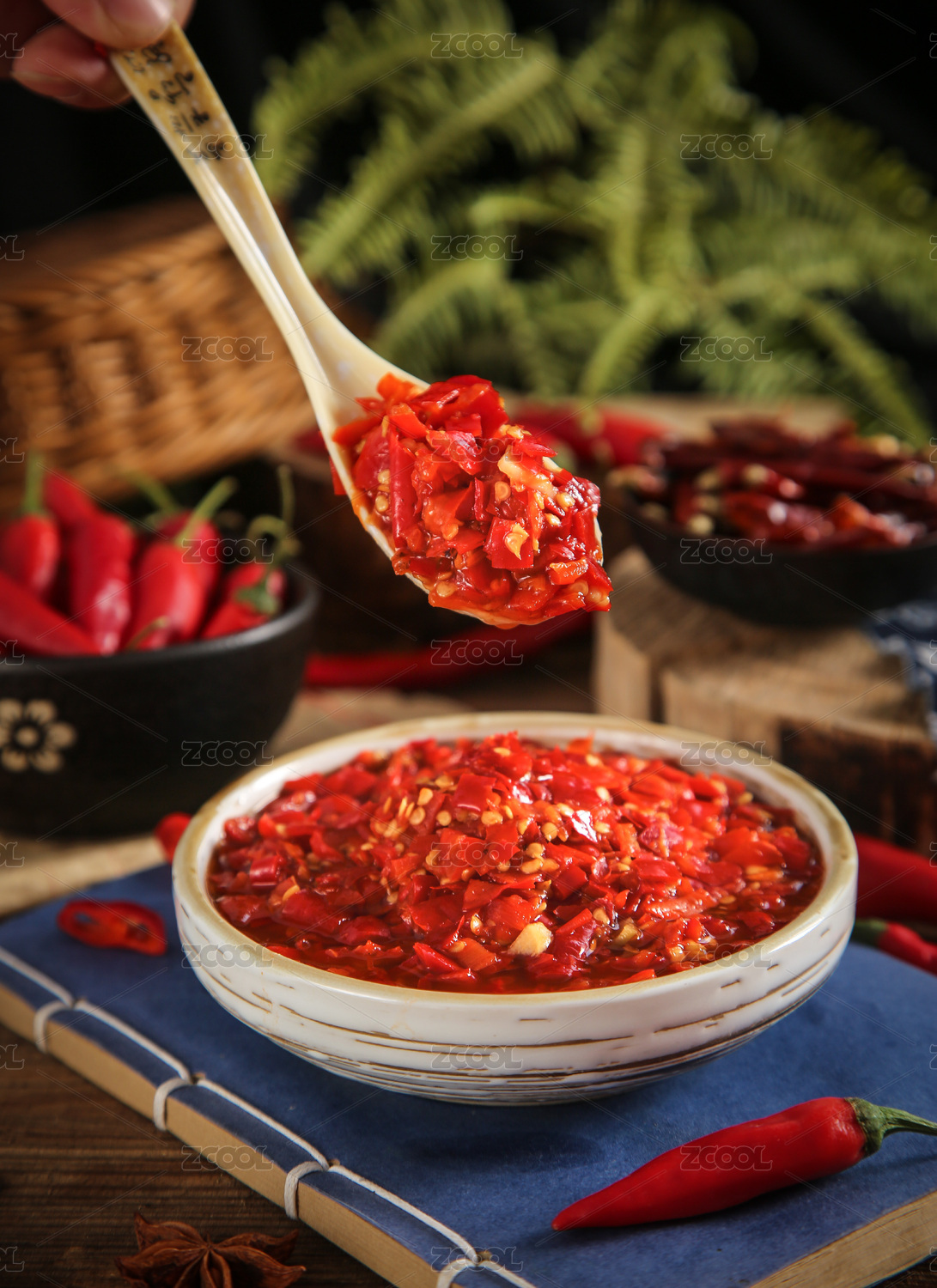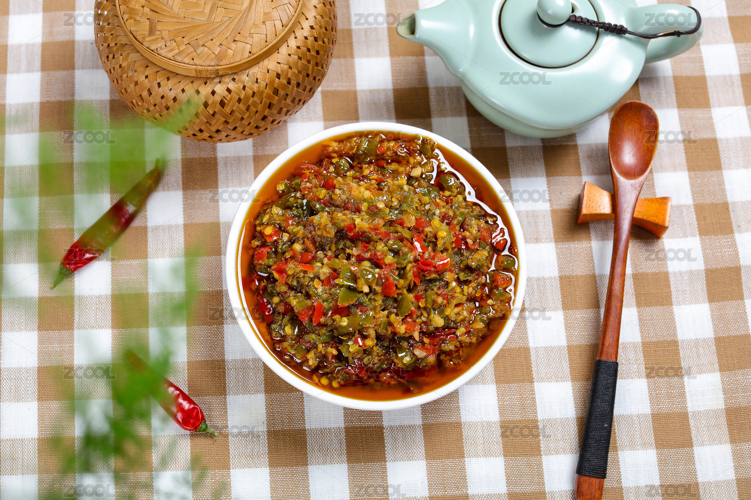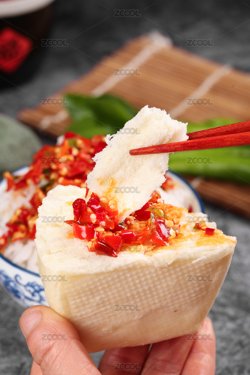 手上拿着馒头蘸着剁椒酱和筷子上夹着馒头