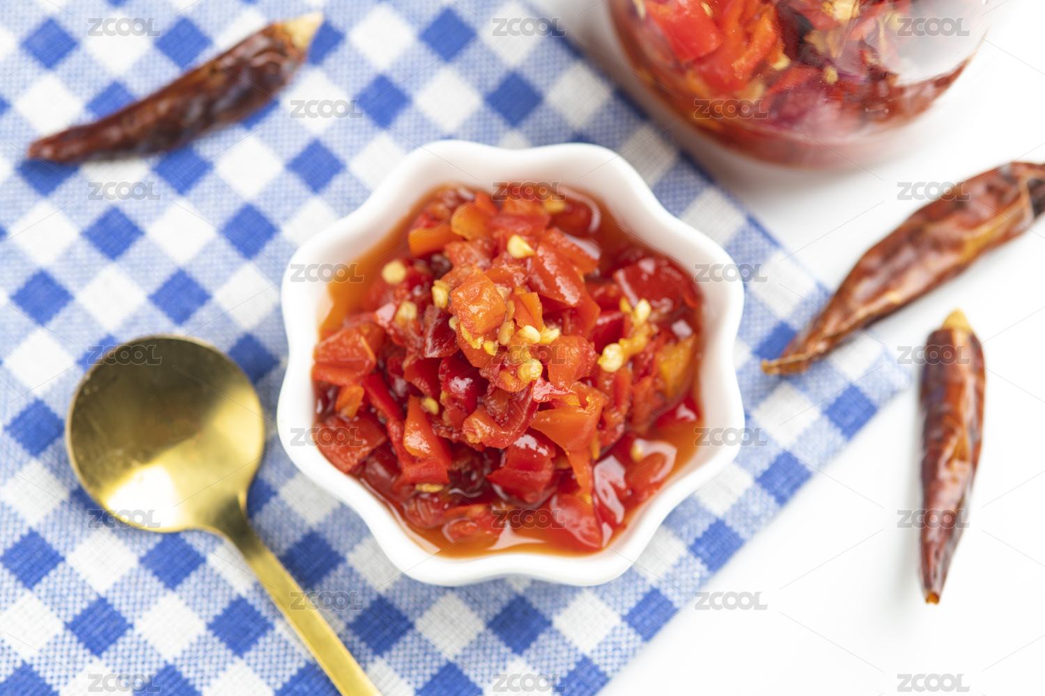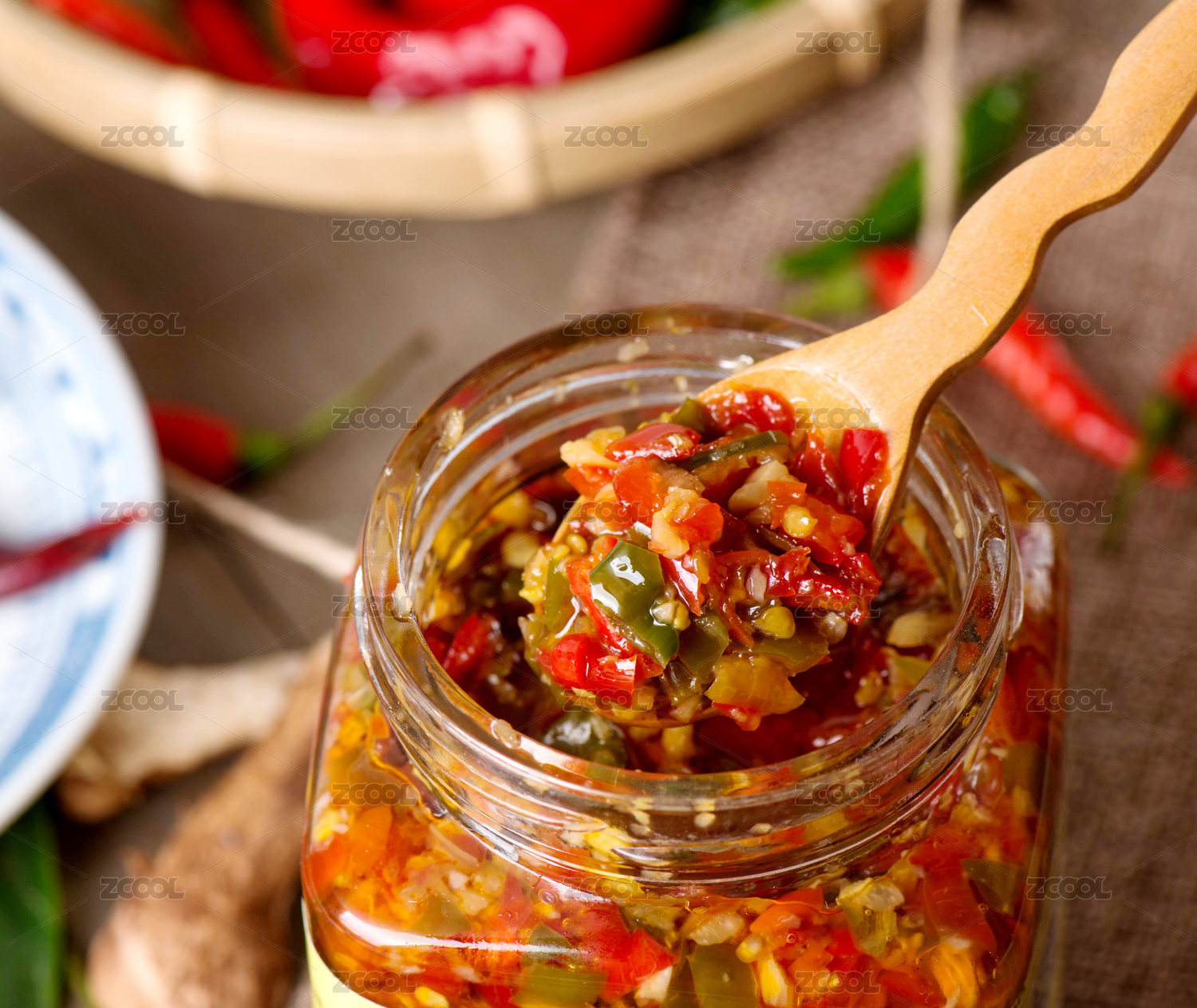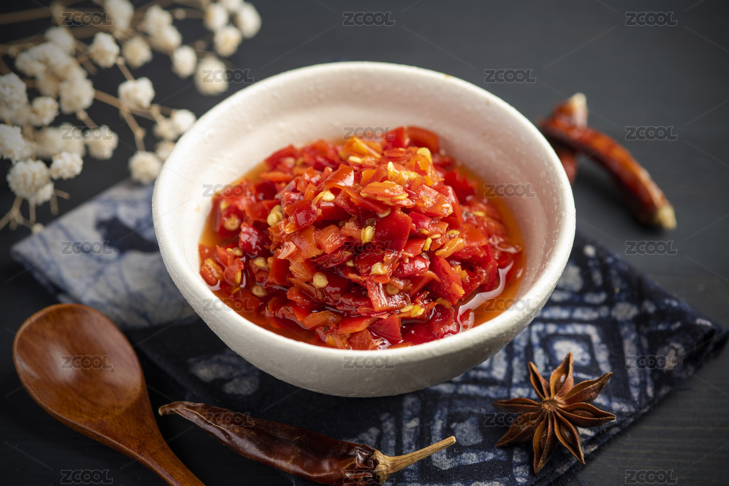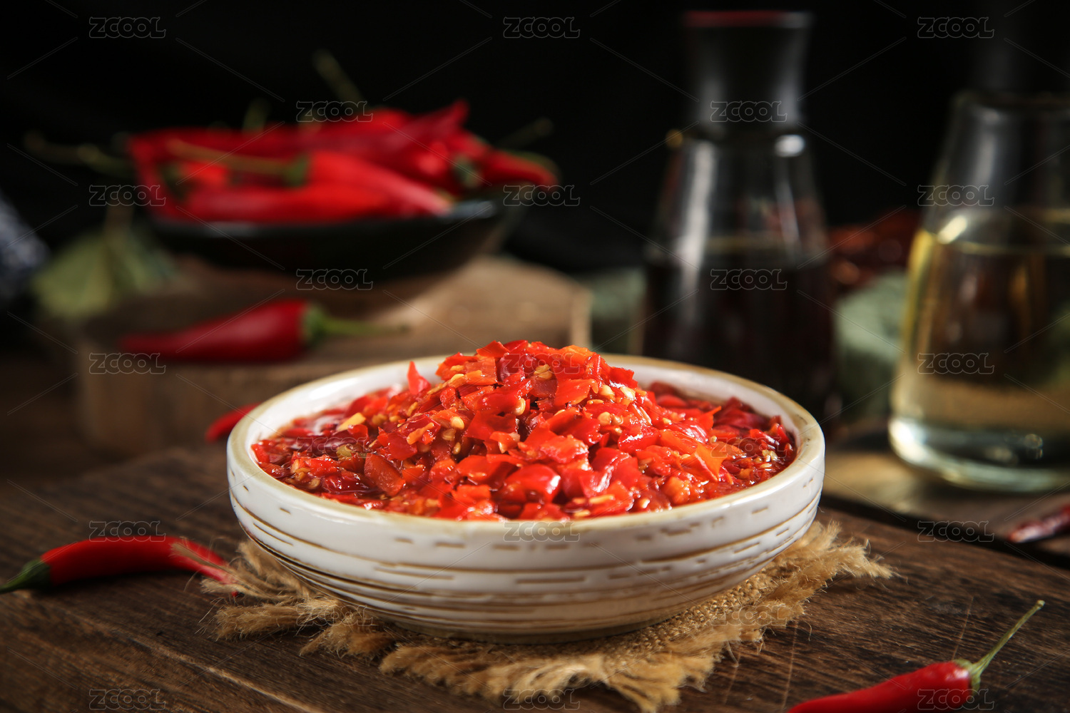 手上拿着馒头蘸着剁椒酱和筷子上夹着馒头