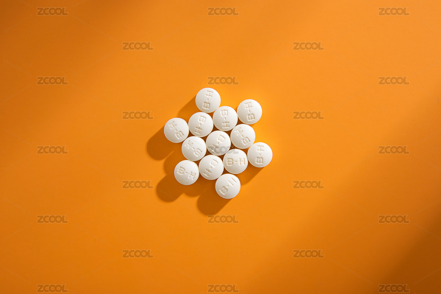 白色药片整齐排列在橙色背景