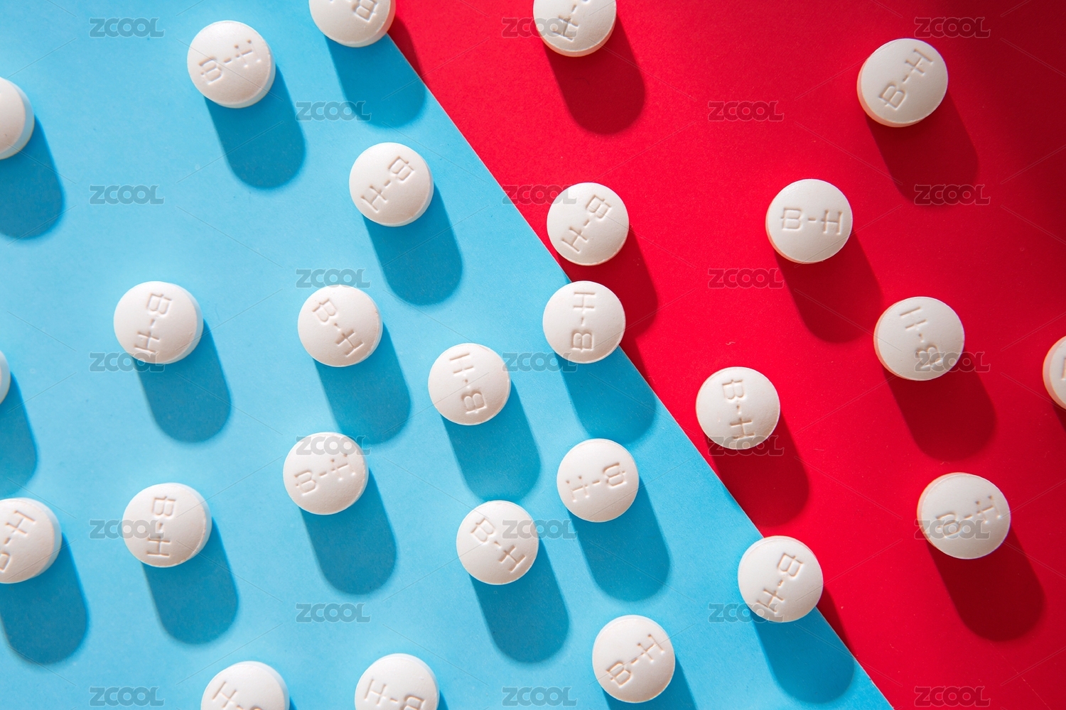 白色药片整齐排列在红色蓝色背景