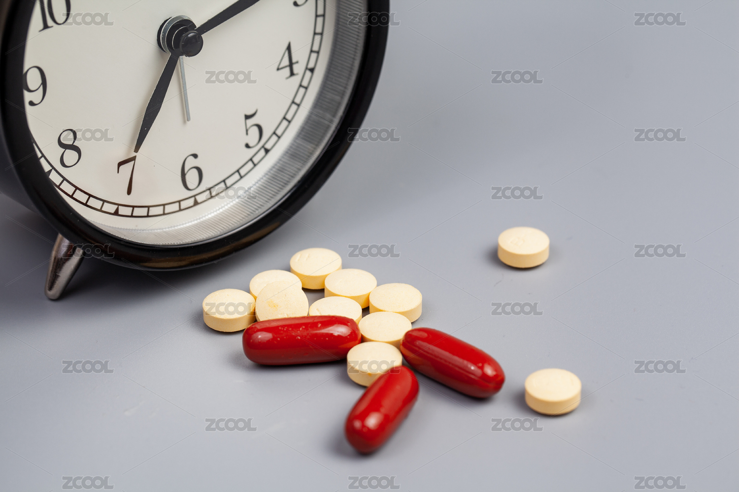 桌面上钟表和药品药片