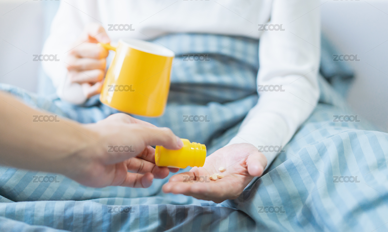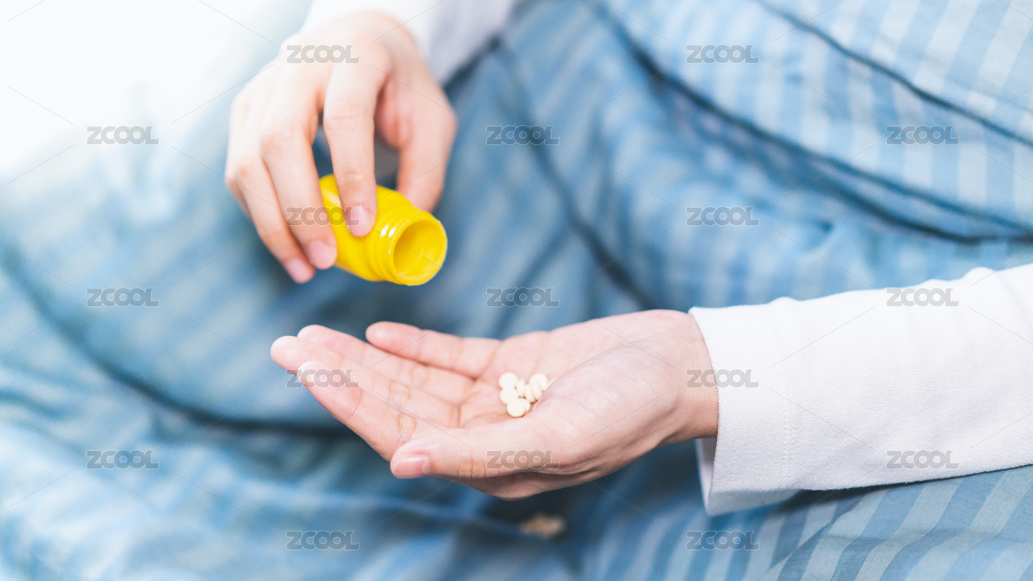 一只手正在给卧病在床的人倒药片
