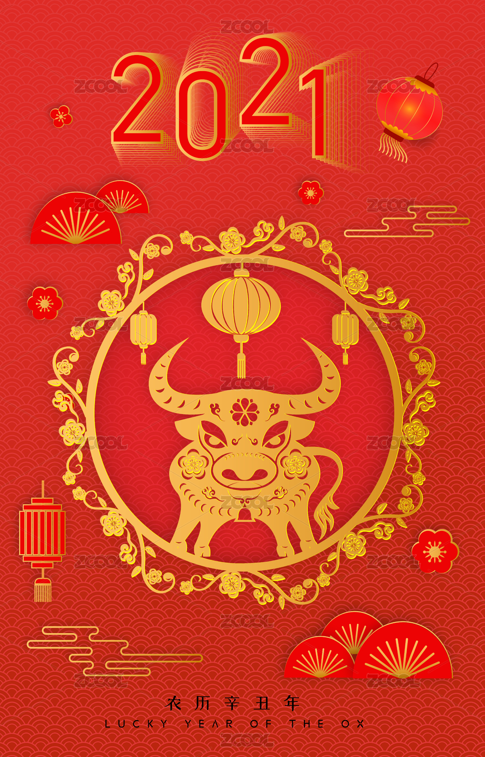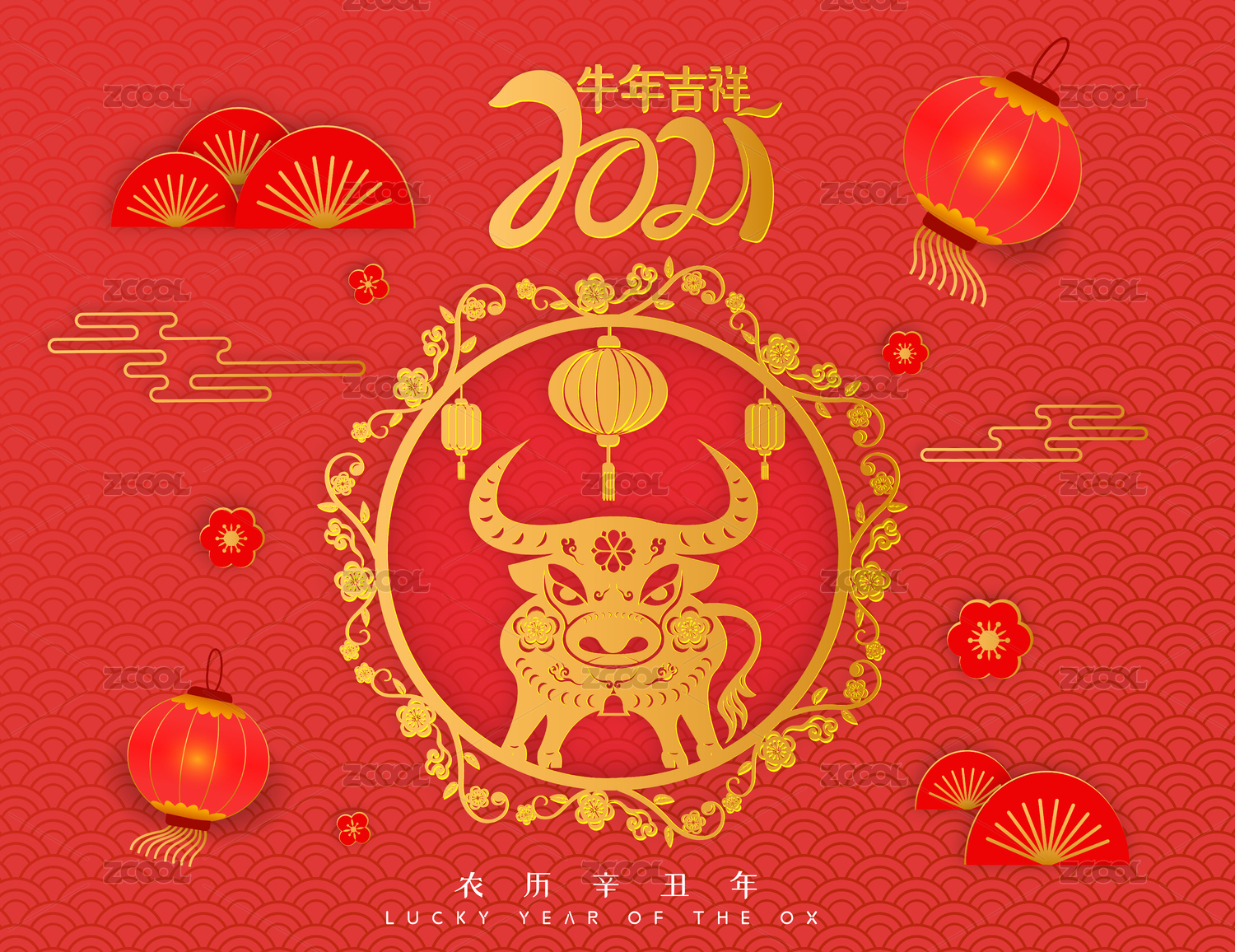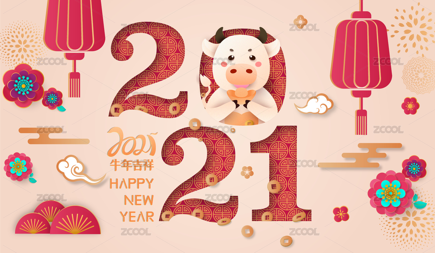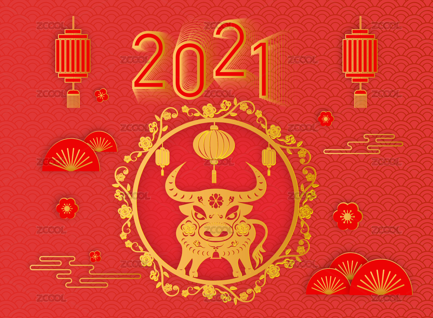 2021年春节新年牛年剪纸生肖牛招财进宝