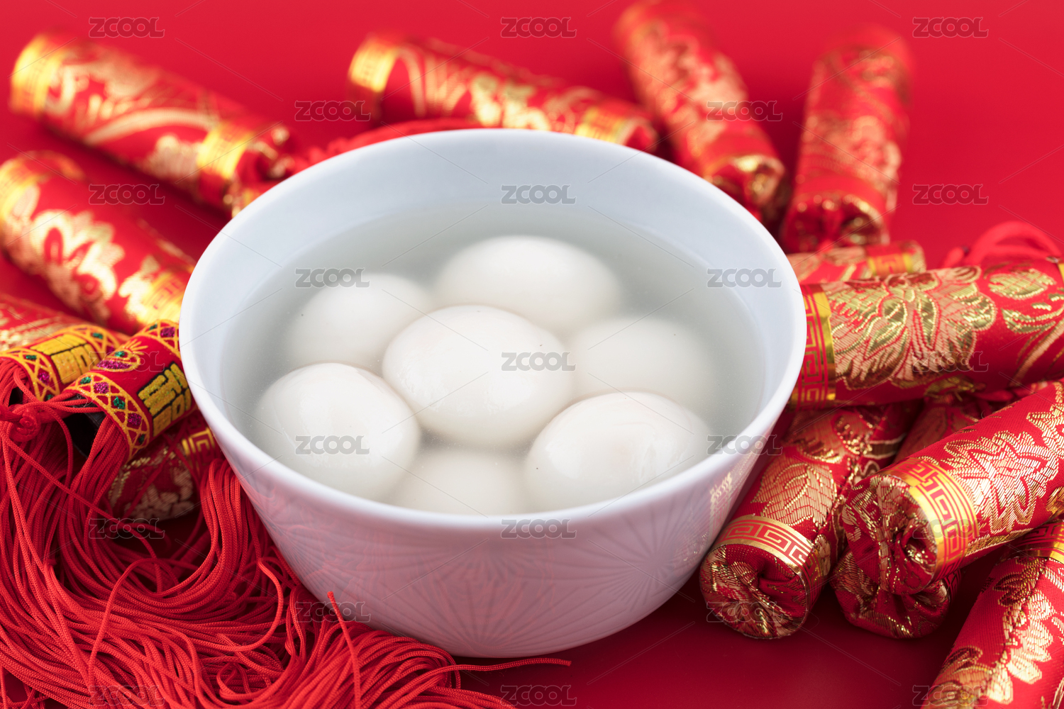 鞭炮装饰里的一碗汤圆食品