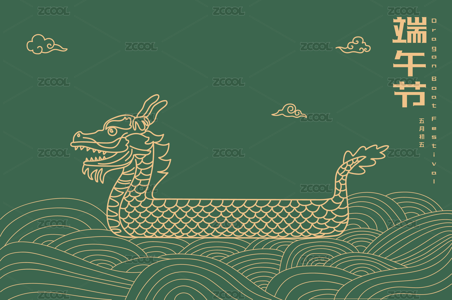 端午节粽子龙舟中式线描矢量插画海报