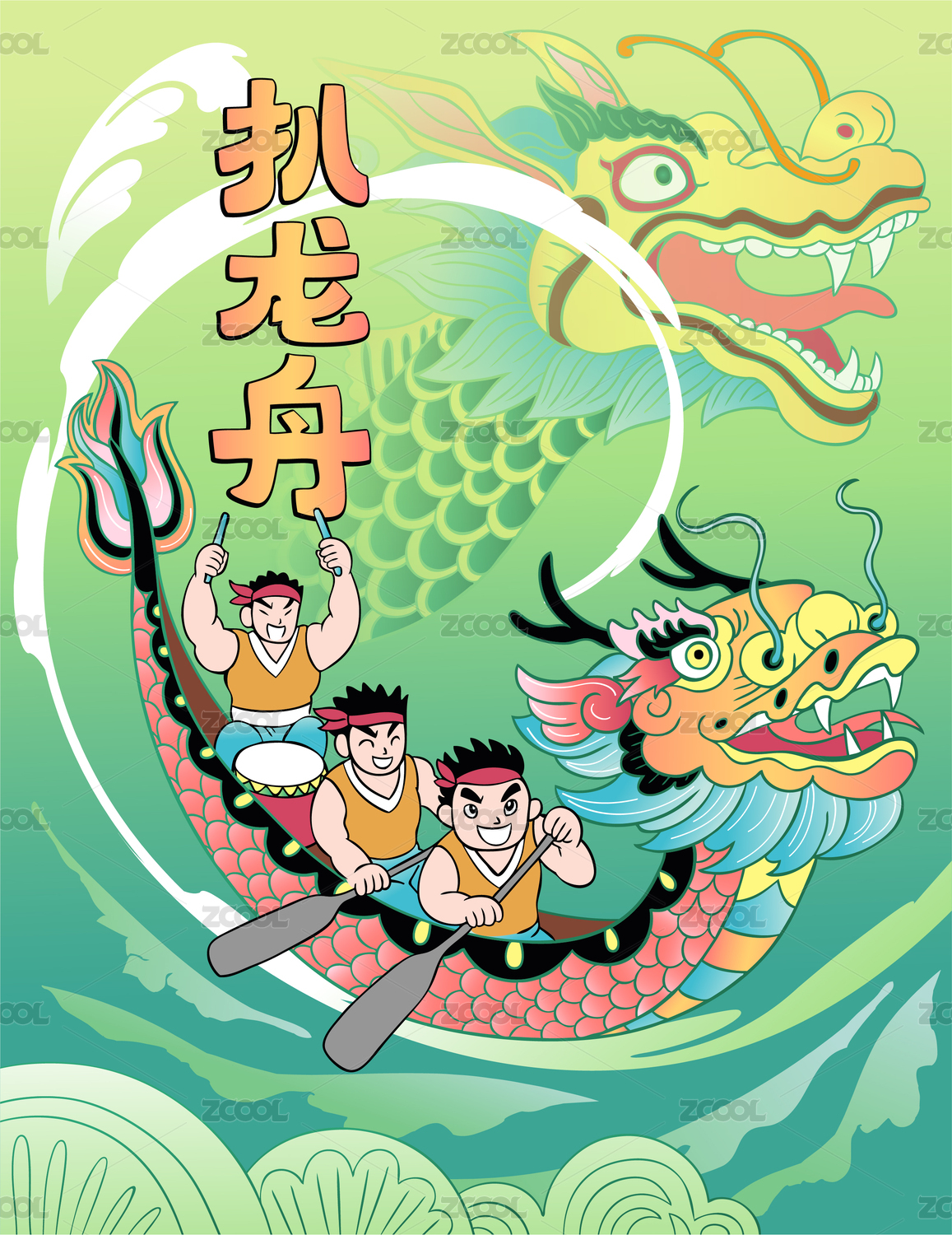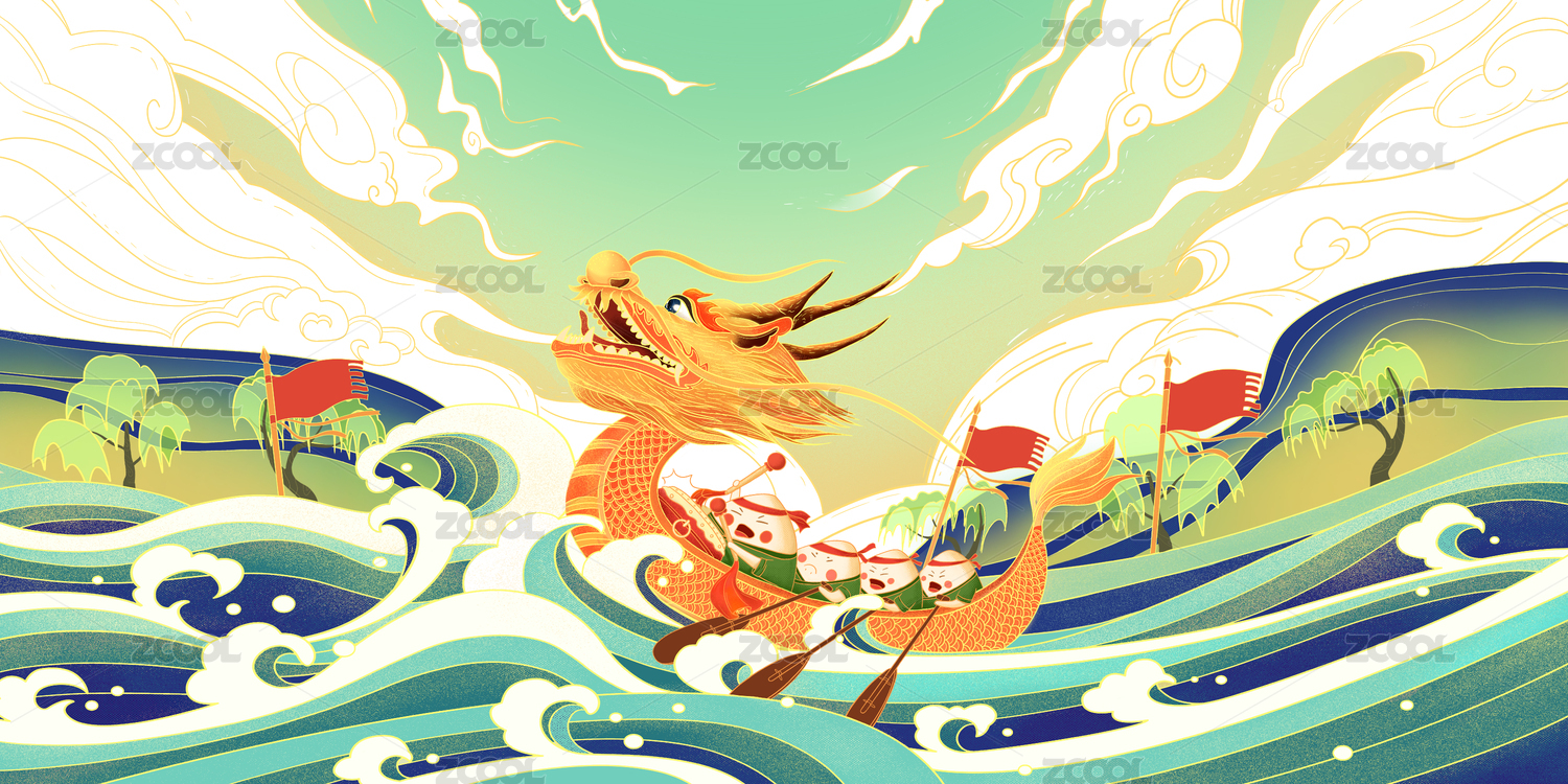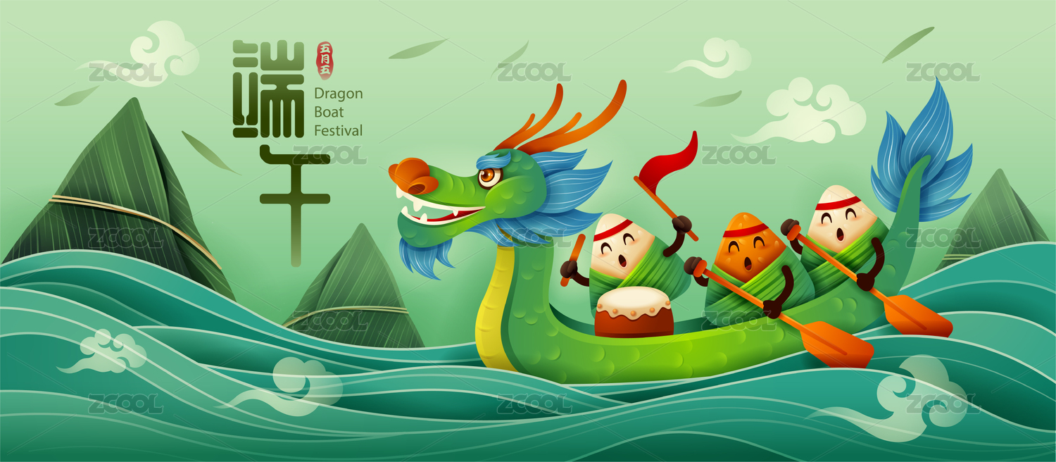 五月初五端午节快乐卡通粽子赛龙舟国潮插画