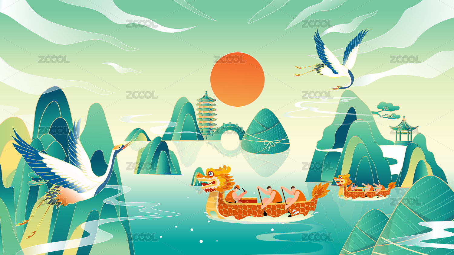 端午节国潮插画中国风龙舟粽子传统节日海报